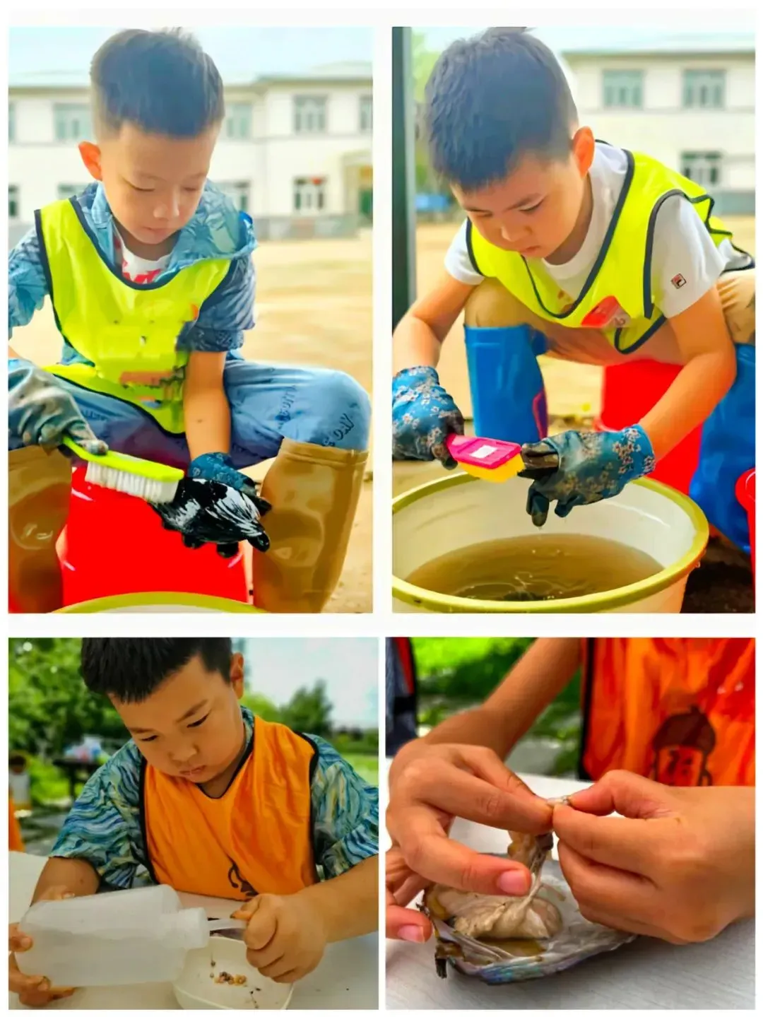 开蚌取珠环节是最激动人心的,一颗颗珍珠在蚌壳中闪闪发光。在取珠之前我们还需要做一些清洗工作,孩子们要把蚌壳外污泥洗刷刷!