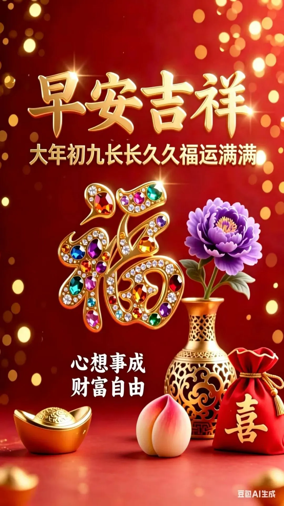 🧨正月初九迎福气,早安问候暖人心!🎉愿您老身体倍儿棒,牙口好胃口好,听戏跳舞兴致高,儿孙绕膝享天伦,平安喜乐长长久久,万事皆顺意!🌸✨