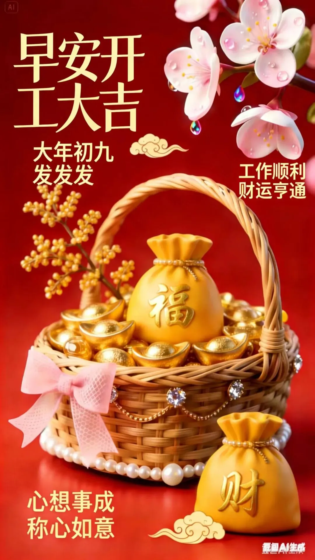 ☀️正月初九早安呀!🧧天公诞辰福满门,祝您福寿绵长久久久~晨起喝杯温清茶,精神抖擞身体健,腰腿灵便无烦恼,儿孙绕膝笑开颜,平安顺遂伴朝夕!✨🎈
