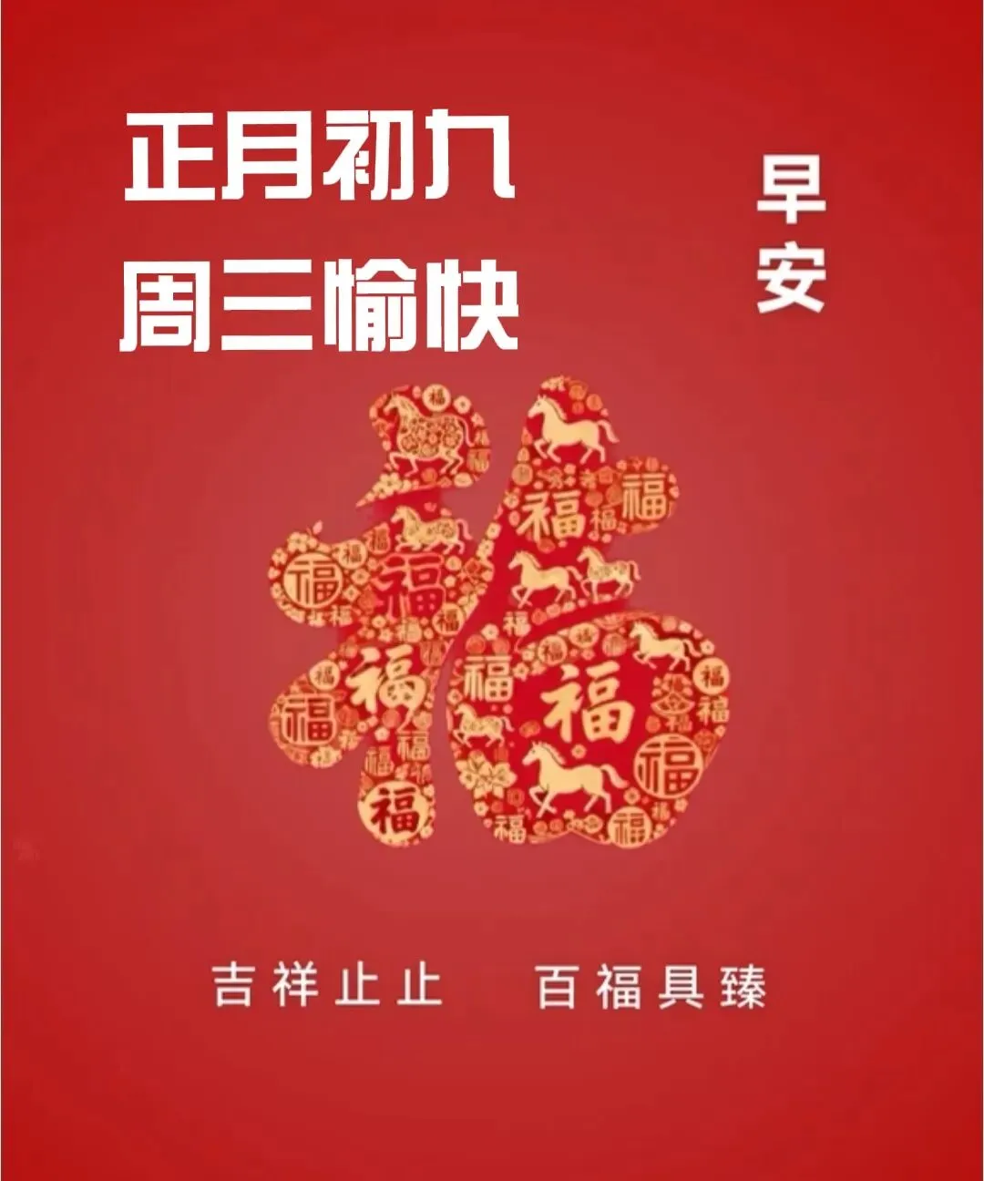 愿这正月初九的清晨,福气东来,好运连连,让新岁的温柔馈赠,铺满往后的每个日常;愿你平安健康常伴,福气满满绕身,所求皆所愿,所行皆坦途;愿这个周三,带着新春的吉祥,开启元气满满的一天,工作顺顺利利,生活和和美美,一切都好,万事胜意。