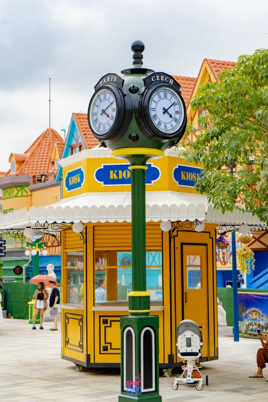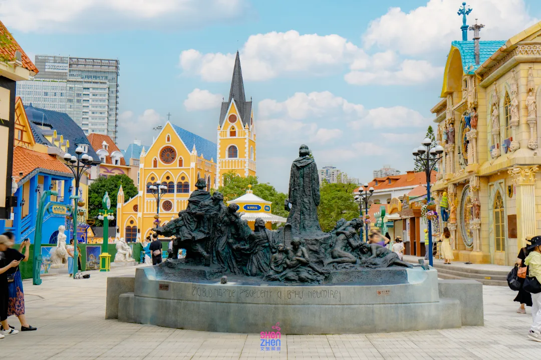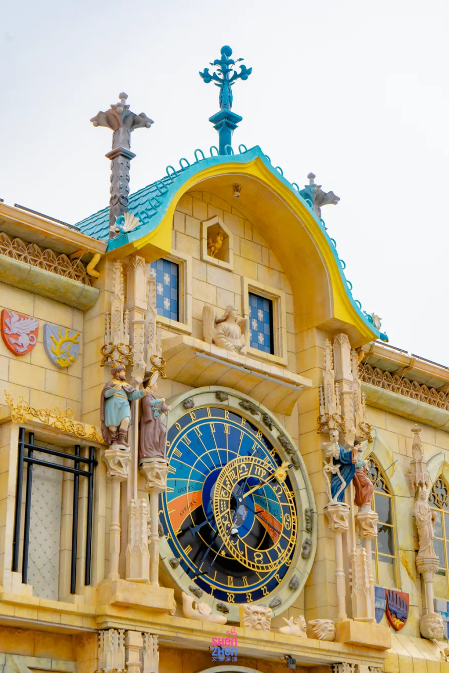 小镇中间有一个「布拉格天文钟」,欧式的古老钟楼造型亮眼,周边的喷泉、时钟与雕塑是小镇人气最旺的打卡点之一,一秒穿越到捷克首都的布拉格广场!
