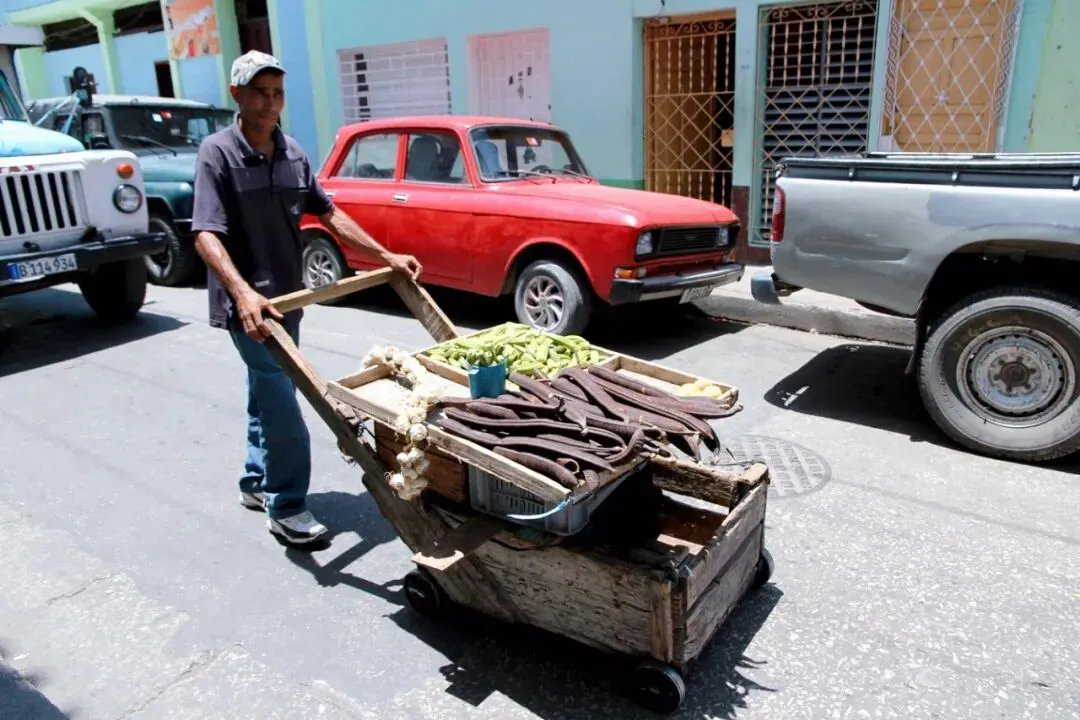 古巴首都哈瓦那街头,还有卖菜的木头推车,长这样。