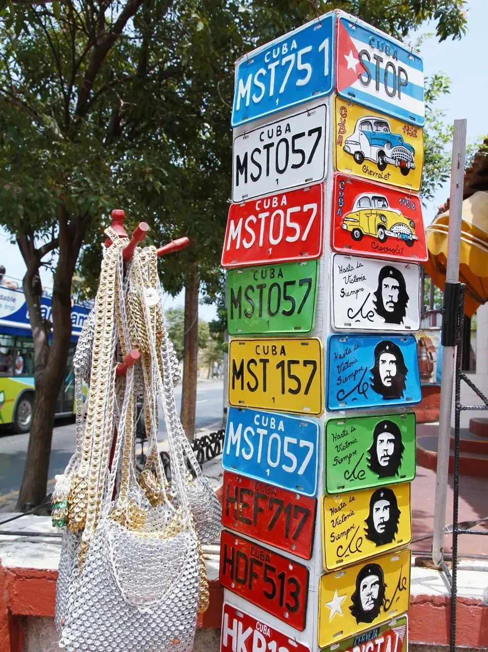 在古巴街头,T恤、帽子、背包、杂志、纸币、明信片、邮票、绘画、漫画、墙壁、车灯、车牌、车头挂饰……