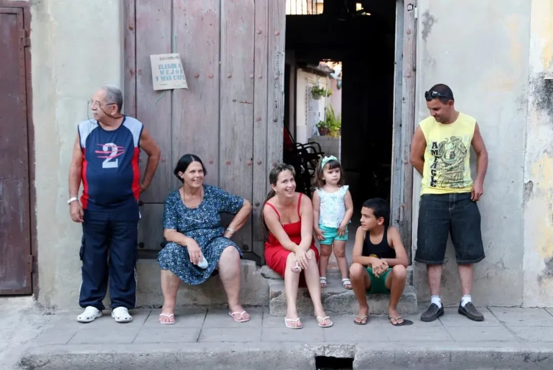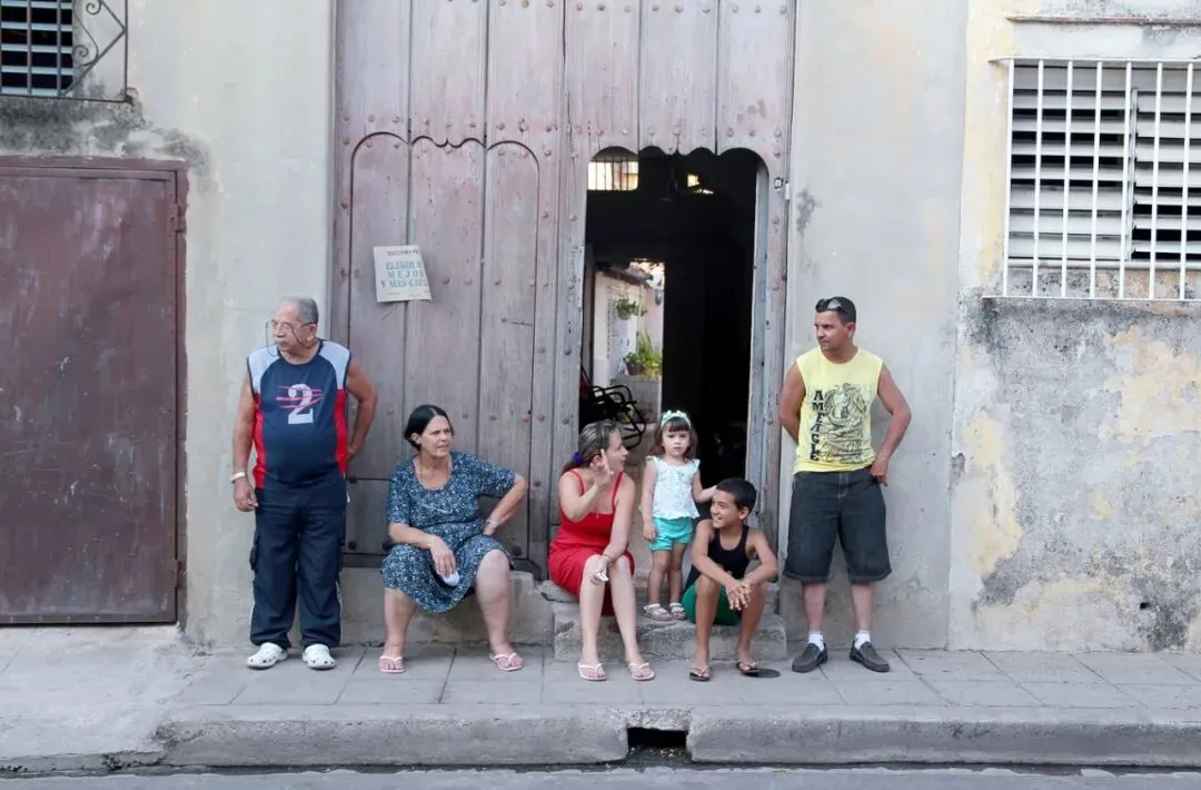 在哈瓦那老旧街区一户破败的院子门口,拍到这样的一家人,聚在门口悠闲地聊天。