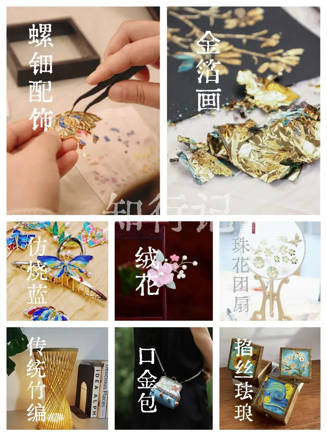 彩绘油纸伞、彩绘京剧脸谱、风筝、泥塑、面点、掐丝珐琅、扎染、绒花、大漆团扇、花草灯、拼布、香包、拓染、造纸、竹编、刺绣、制香、景泰蓝、养生锤、五谷画、金箔画、雕版印刷、、螺钿、灯彩、剪纸、绢人、中国结、盘扣、篆刻、点翠、汉服……