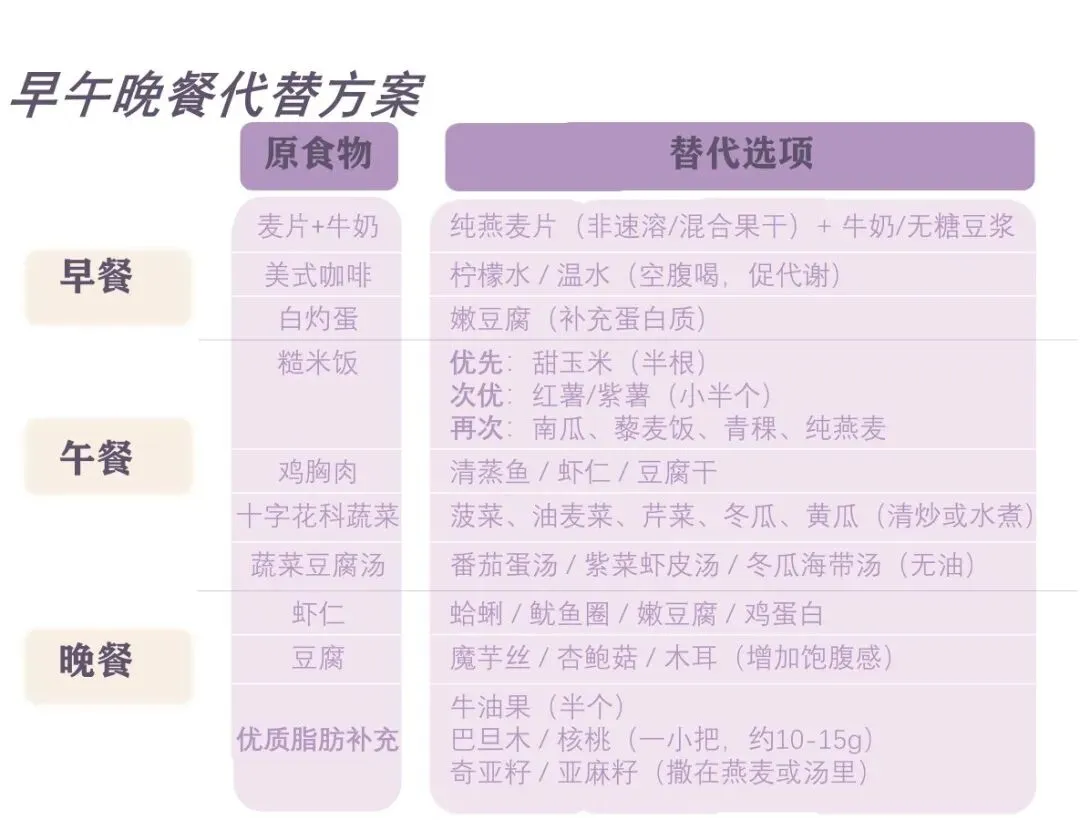 早上纯燕麦片泡牛奶或豆浆,咖啡换成柠檬水,鸡蛋吃腻了换茶叶蛋或嫩豆腐。