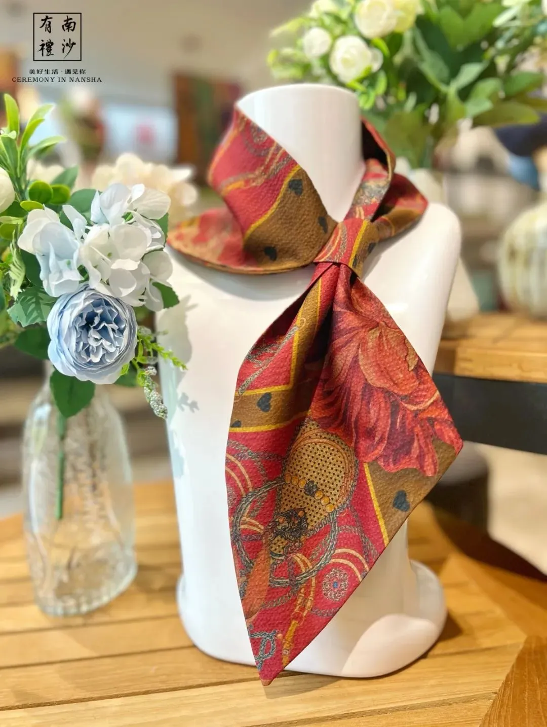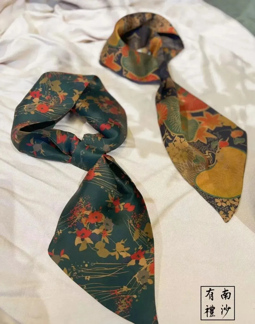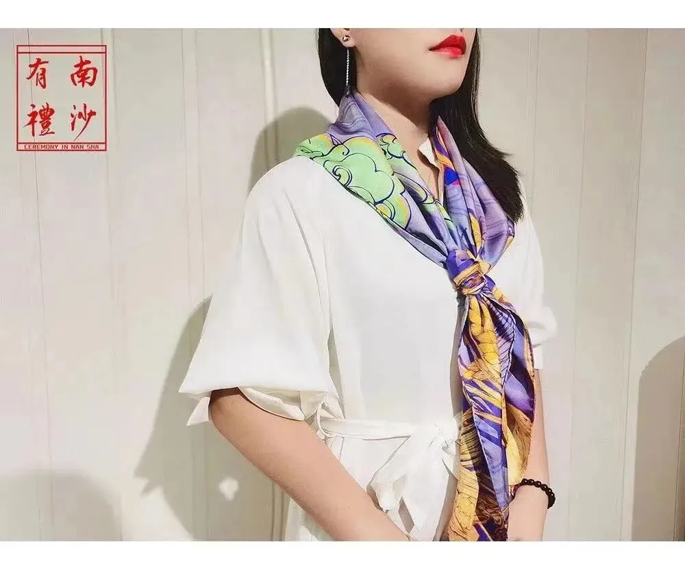 以黄阁麒麟和南沙文化农作物作为设计灵感,双面斜纹的工艺,进行了大胆的色彩搭配,佩戴起来鲜明亮眼,成分是100%桑蚕丝。