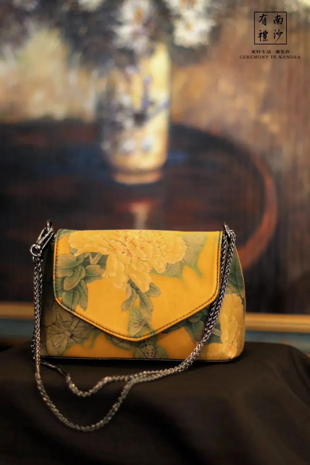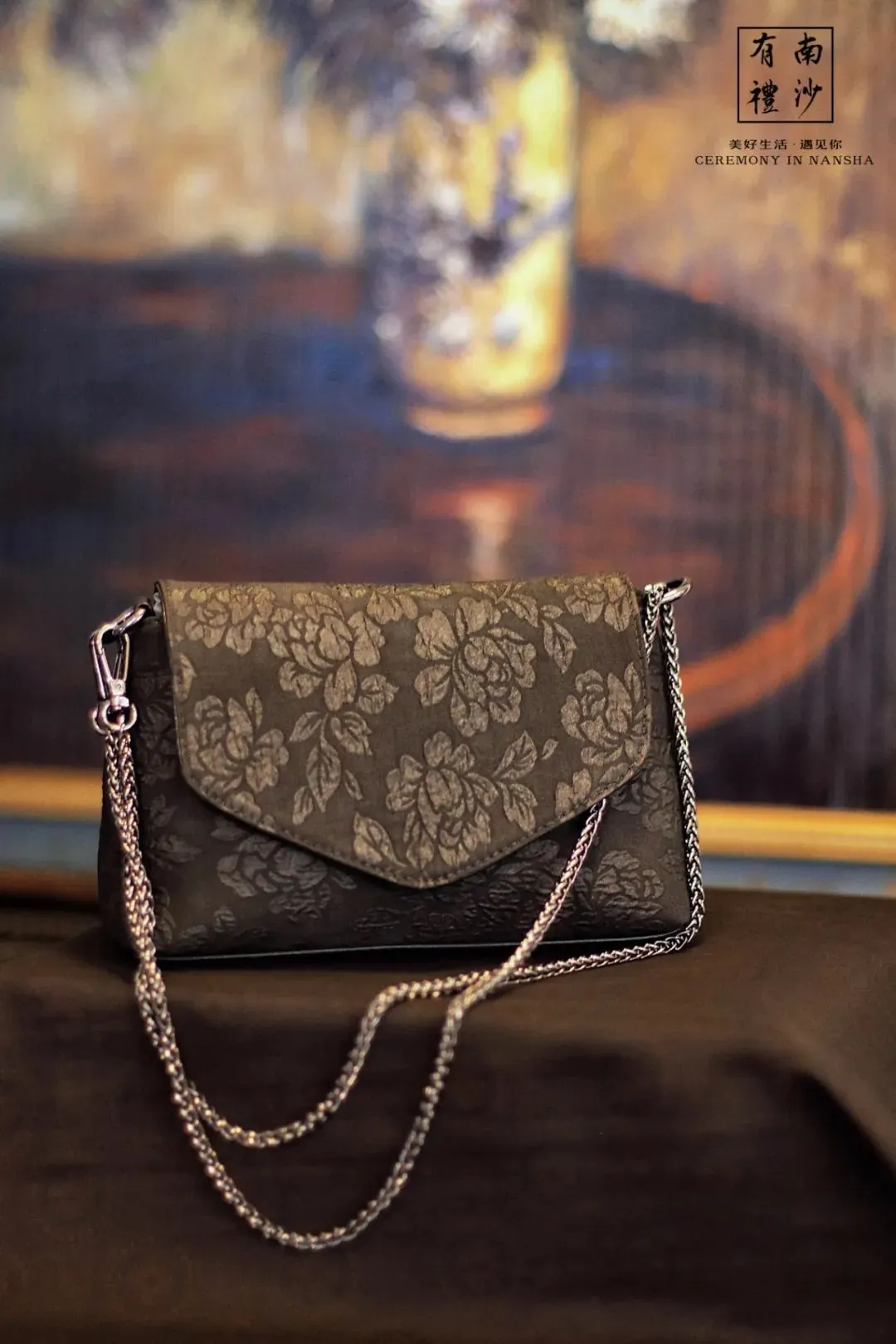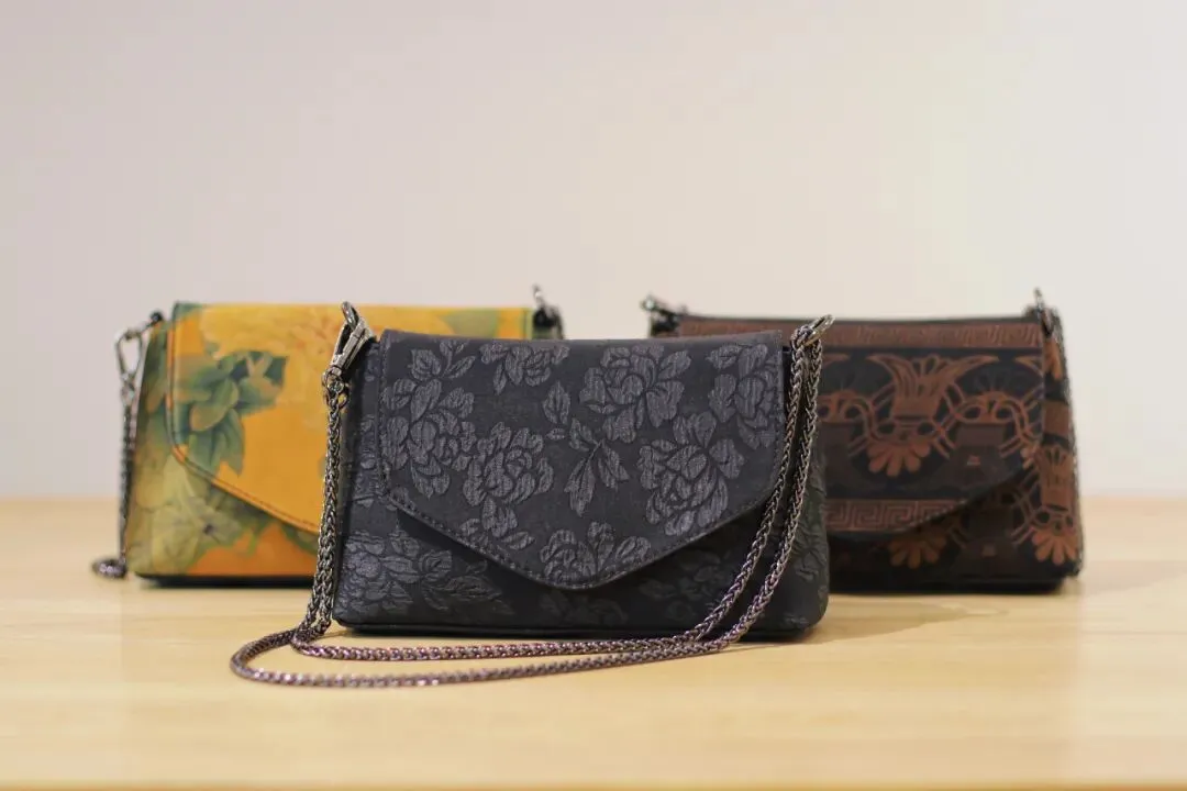 香云纱与皮革制成的包包,小巧却拥有大容量,链条可调节有三种背法,百搭美观。