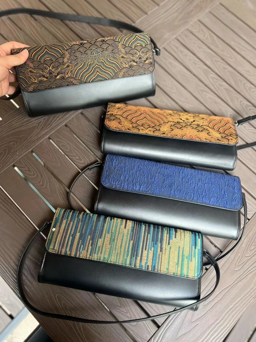 真皮晚宴包,点金之笔翻盖部分是织锦的香云纱,简单得来又不失时尚,敲好搭配衣服,手拿和腋下背都行,适用于各种场合!