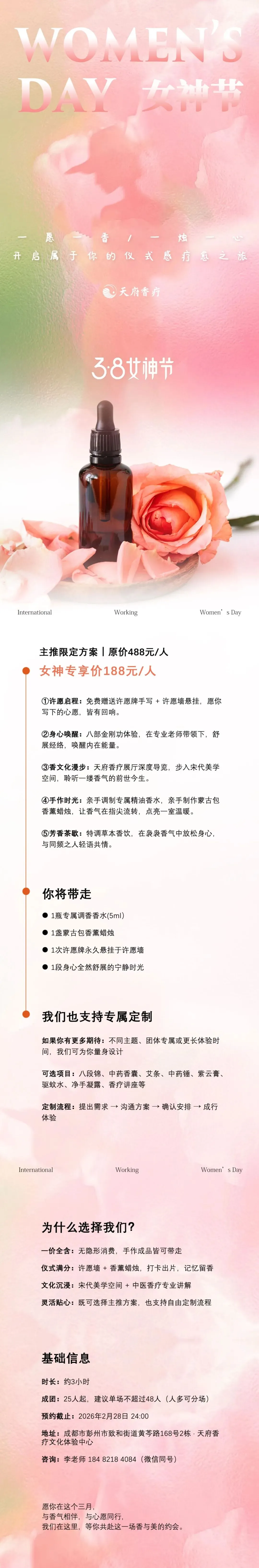 当前位置:首页>美女资讯>3.8 女神节芳香减压沙龙|企业专属定制,活动方案自由搭配 一站式解决方案