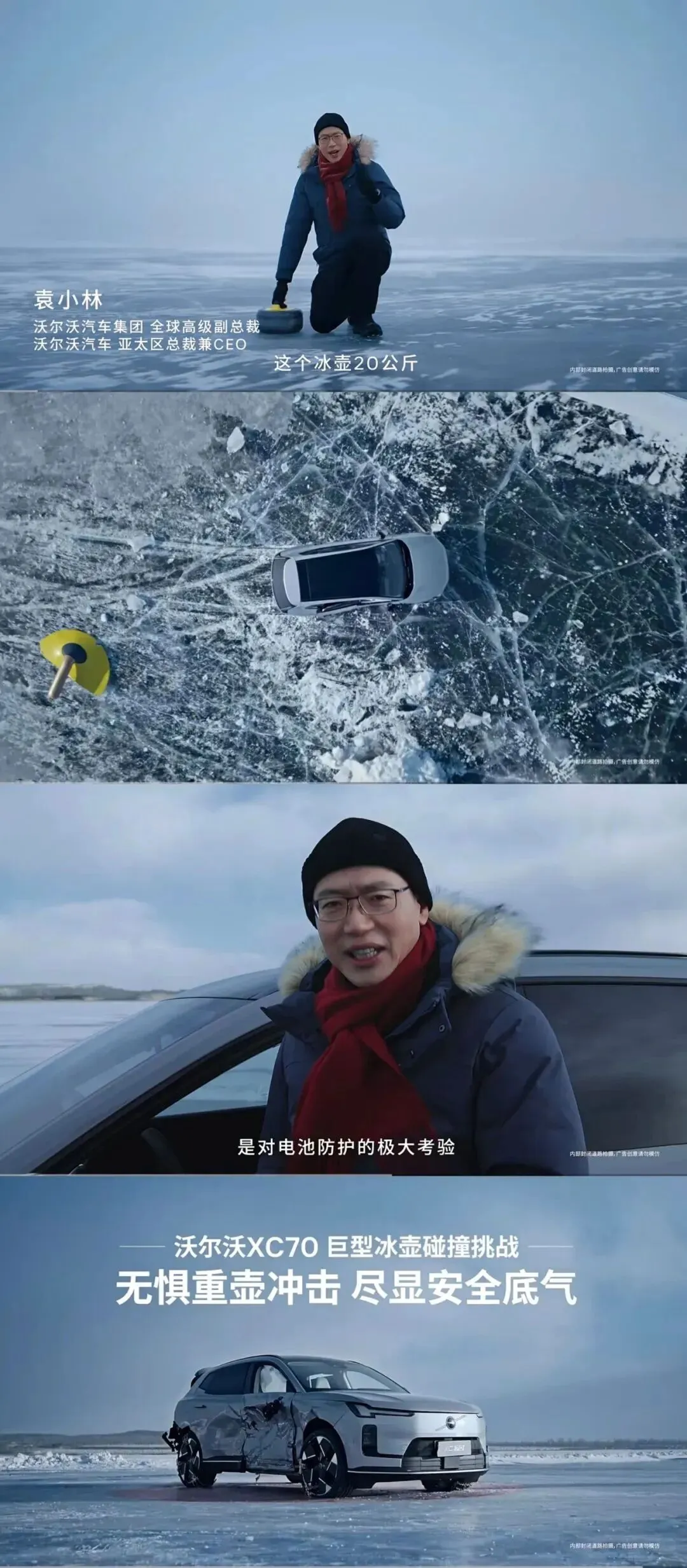春节期间,沃尔沃亚太区总裁兼CEO袁小林亲自上阵,在冰面上演了一场冰壶撞车、总裁亲测的营销大戏。画面惊险、传播度高,乍一看,是沃尔沃对安全的极致自信。