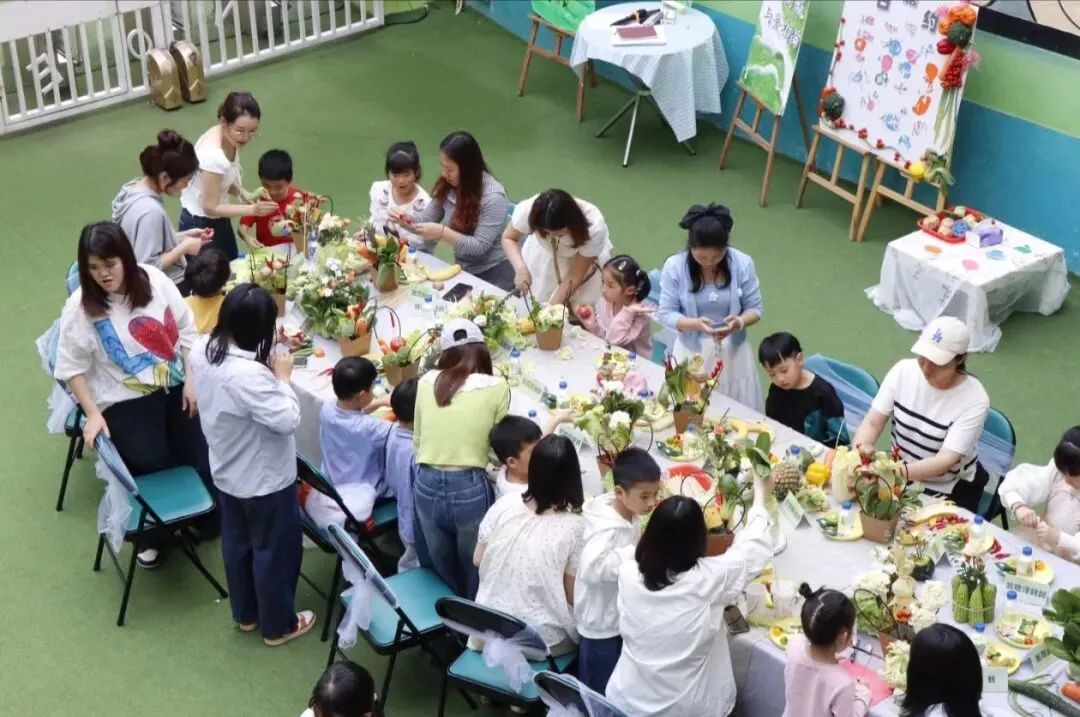 活动内容:幼儿自选果蔬、鲜花(干花),亲子一起制作果蔬花篮。