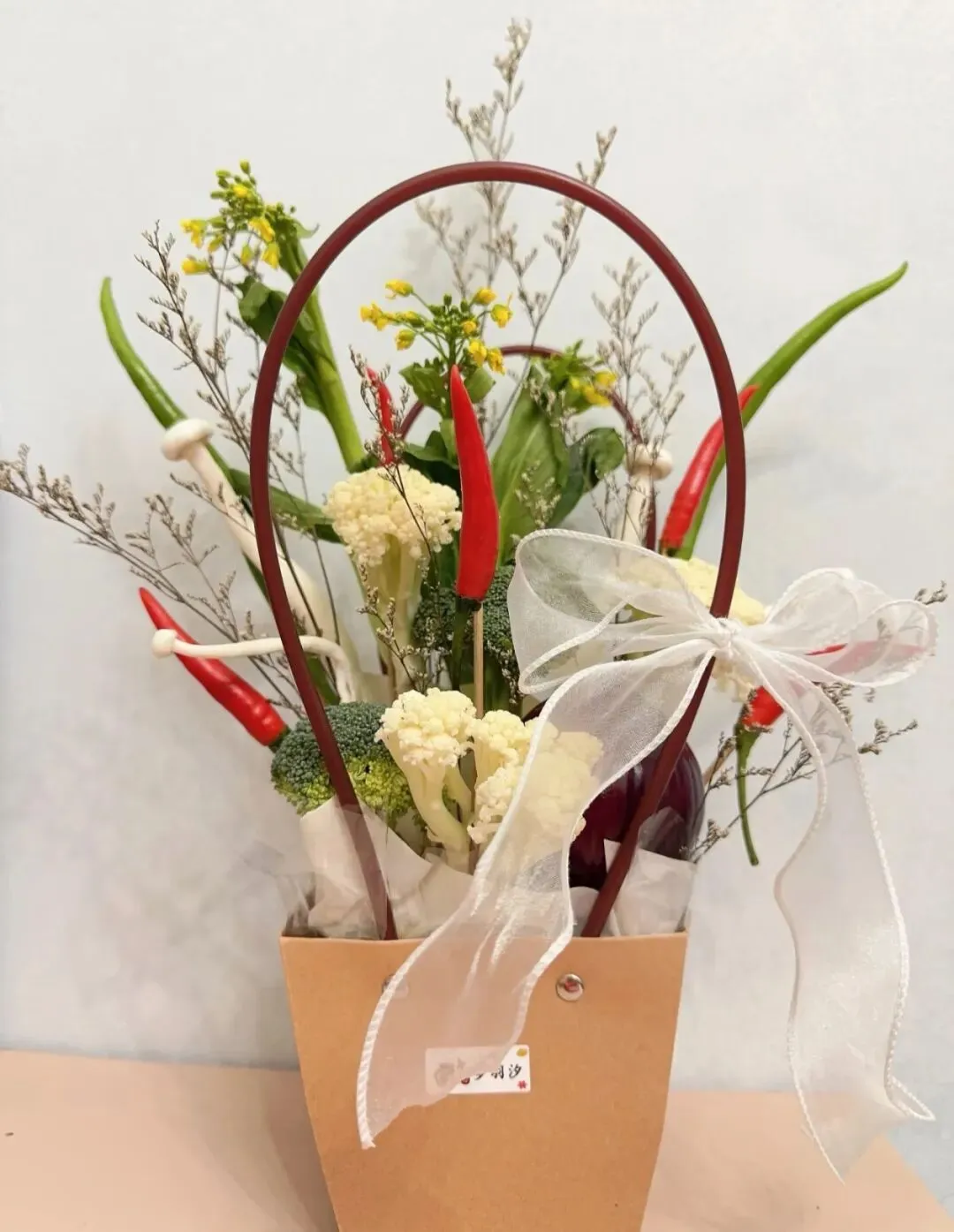 物料准备:花篮、新鲜果蔬、鲜花(干花)、花泥、透明胶带、彩色丝带、剪刀等。