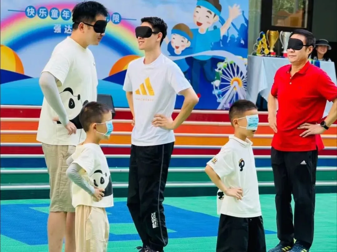 游戏玩法:家长抱着小孩,站在指压板上,听指令做动作,谁坚持得最久为获胜组。
