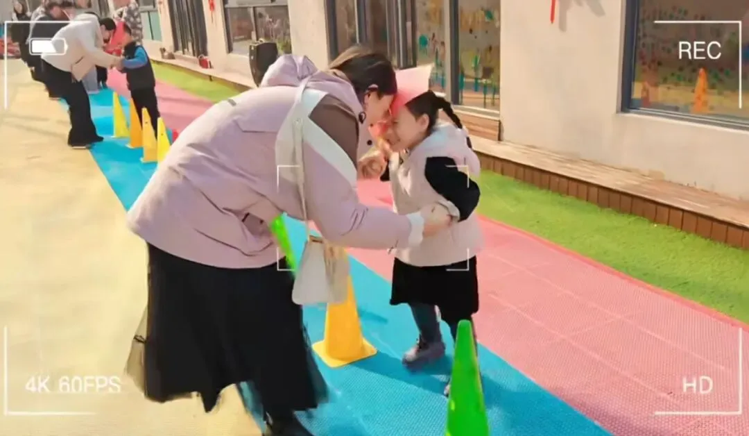 游戏玩法:亲子一起配合,将一张A4纸,从指定起点一起额头对额头,运送到终点。
