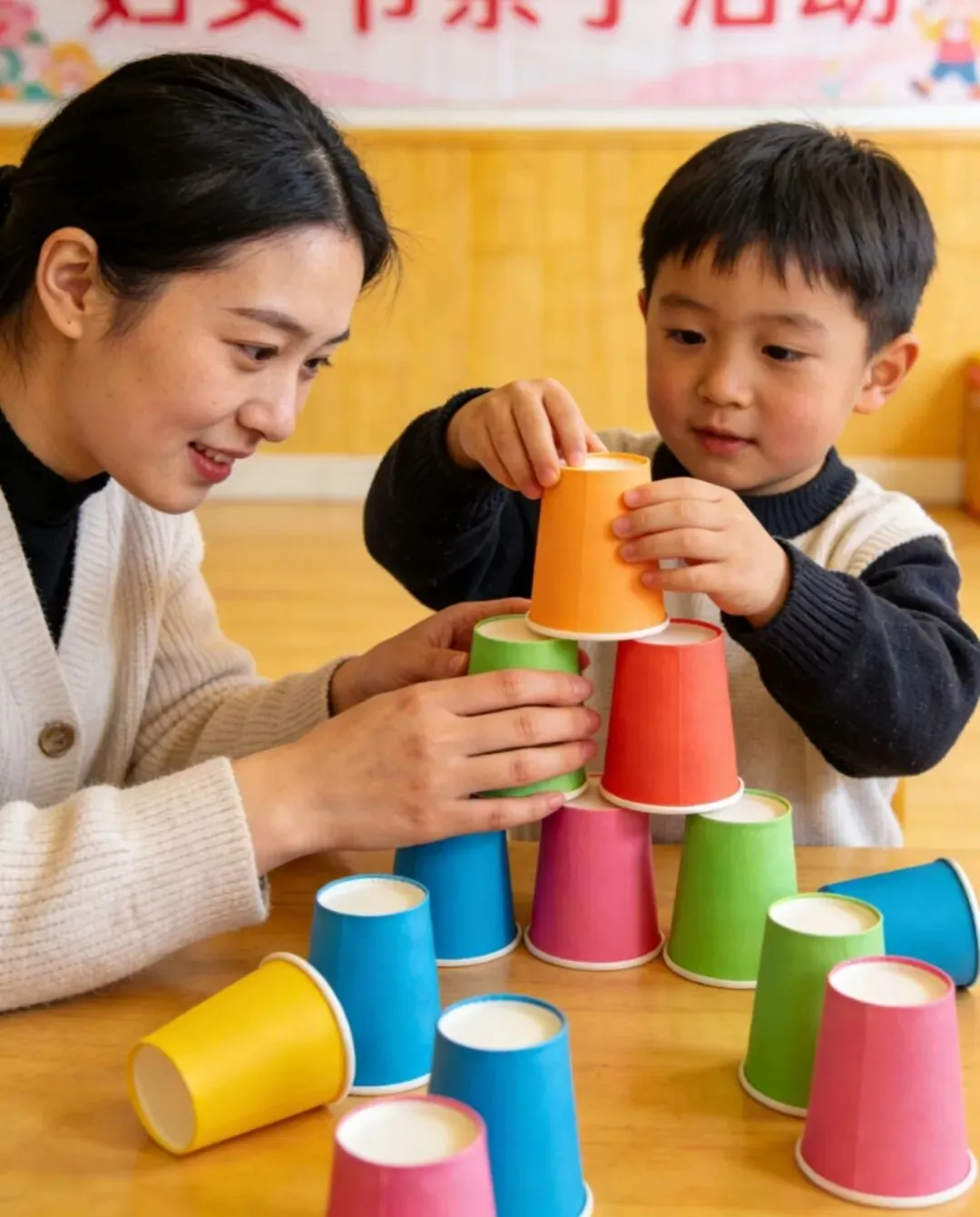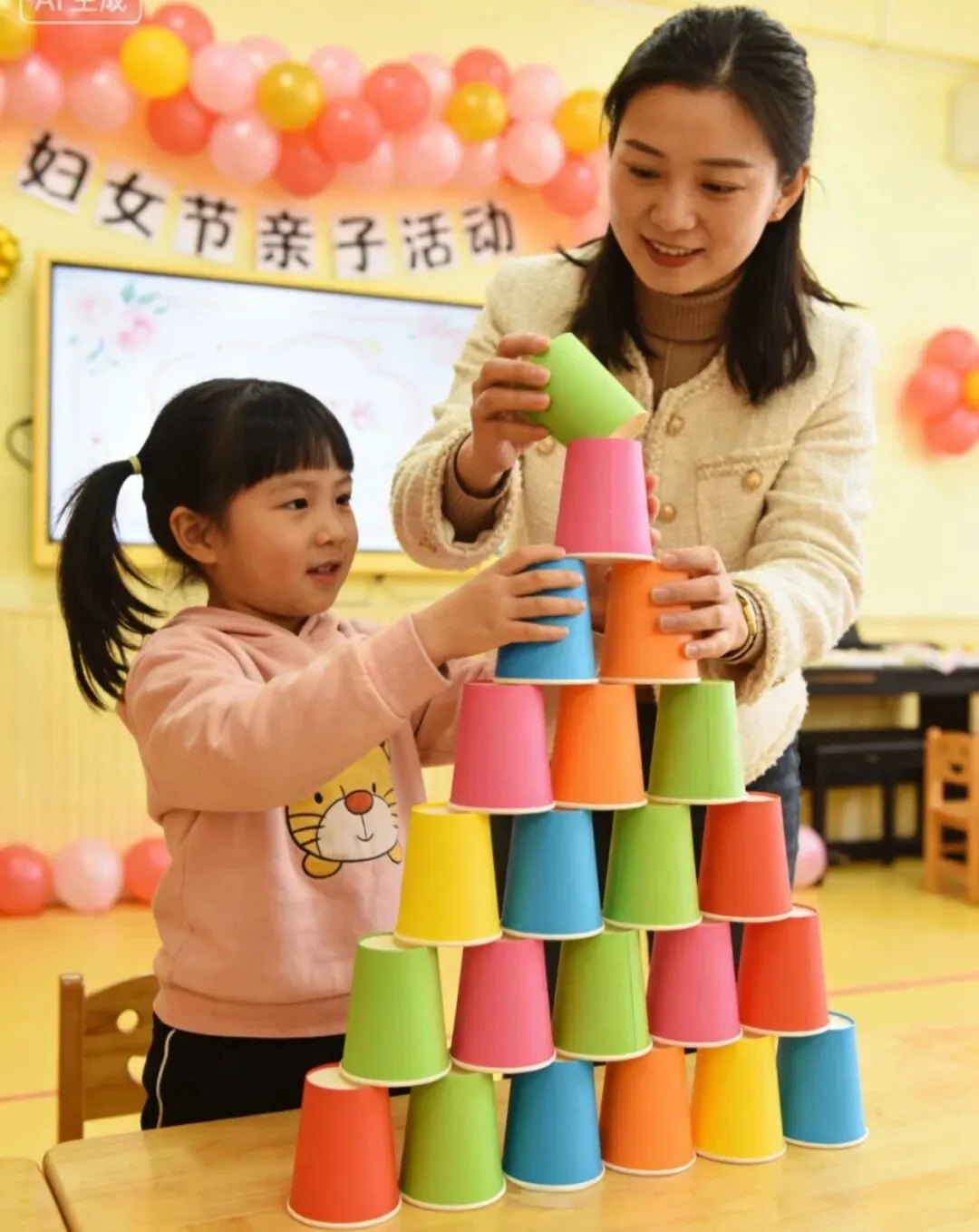 2. 主持人宣布开始后,亲子两人合作,将纸杯逐层叠放,搭成“高塔”造型(如直线塔、金字塔)。