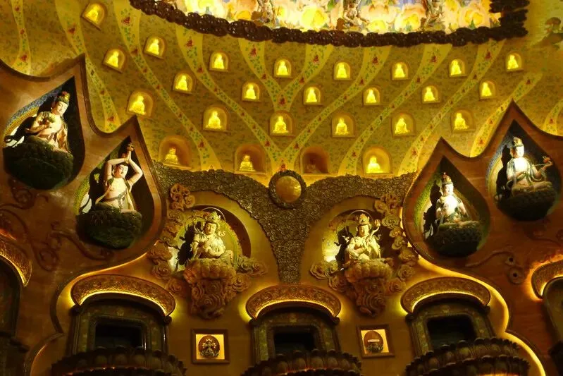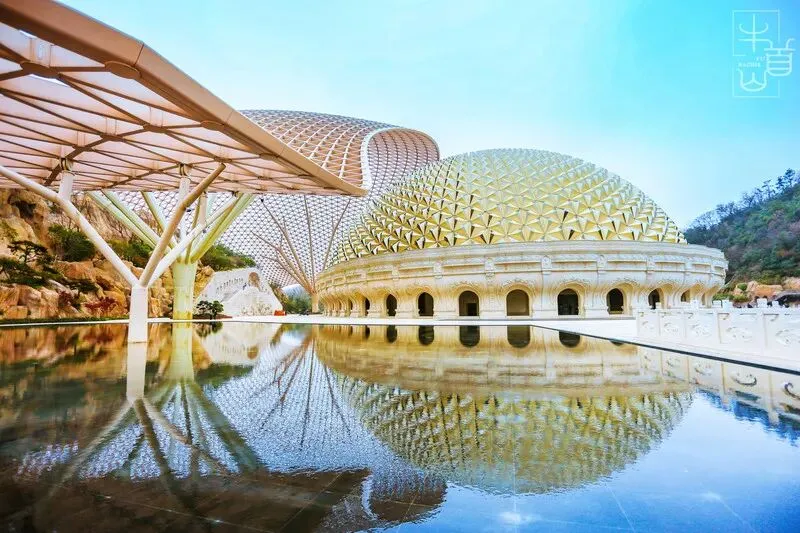 佛顶宫】(牛首山遗址公园内最大看点要数佛顶宫了。世界唯一一颗佛顶舍利:就在牛首山佛顶宫!佛顶宫呈半圆状,整体造型是以巨型莲花托起佛顶发髻的摩尼穹顶,直径超过200米,非常辉煌壮观。在整个穹顶的最底层,整个遗址公园最为神圣的宫殿里供奉着释迦牟尼佛顶骨舍利。供奉佛祖顶骨舍利的仿制圣塔有鎏金、水晶、琉璃、宝石等佛教“七宝”镶嵌,集青铜、鎏金、掐丝珐琅、雕塑、錾刻等数十种传统工艺于一身,再辅以激光投影,堪称精美绝伦)。