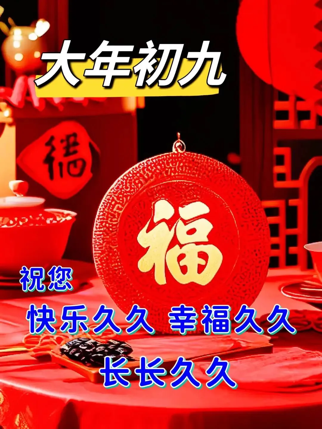 大年初九,相传是一生中最吉祥的日子,送你一份久久的祝福,只有幸运的人才能收到,现在打开人是你,说明你真的很有福,你注定会拥有久久的幸福。🌹🎁😊🎉🌺🤝☕
