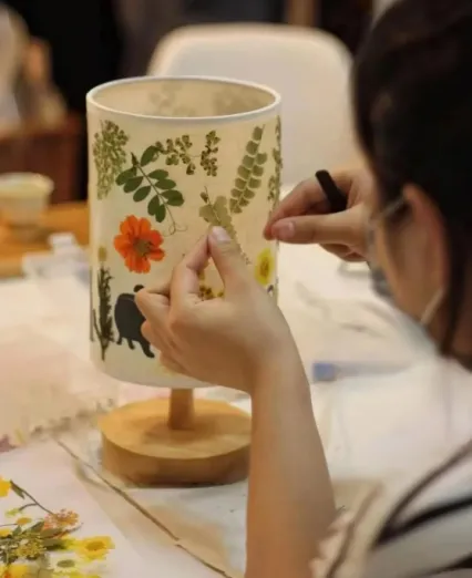 ▫️集中疗愈:情绪破冰后,进行古法压花台灯制作,在创作中释放情绪