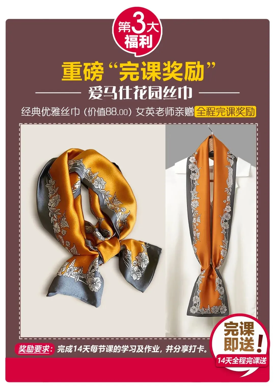 🧣福利三:完课奖励!价值88元精美丝巾等你拿!坚持就是胜利!只要你完成14天全部课程学习、按时提交作业,并分享打卡记录,即可获得由 女英老师 亲赠的 “爱马仕花园”系列精美丝巾一条(价值88元)!