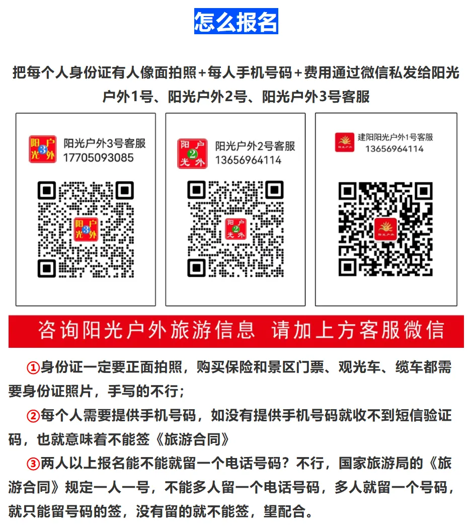 2、请携带本人身份证,出示闽政通健康码,以便景区等按照防疫要求核对身份信息。在旅游期间敬请配合旅行社、景区工作人员的引导,按景区要求有序进行游览,人与人保持适当的距离,服从安全员引导工作。