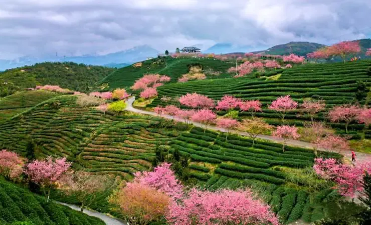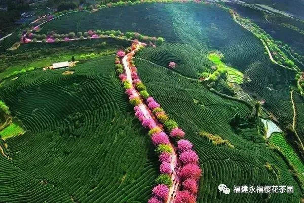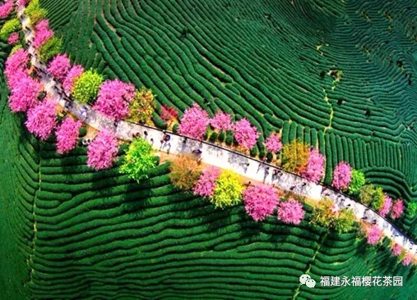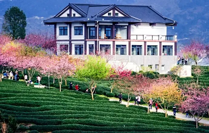 目前台品樱花茶园已形成“十里樱花、千亩茶园”的浪漫、壮观景象。