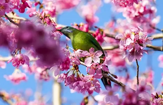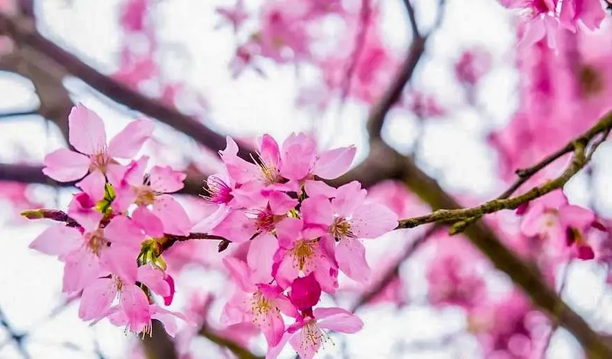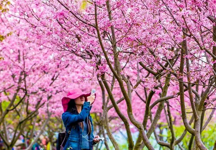 每年春季盛开的有台湾山樱、雾社樱、日本绯寒、吉野、富士、八重樱等品种,花朵有单瓣也有多瓣。单瓣樱的花朵向上盛开,绽放灿烂的花容;多瓣樱的花朵微垂枝头,不胜春风的娇羞含蓄。