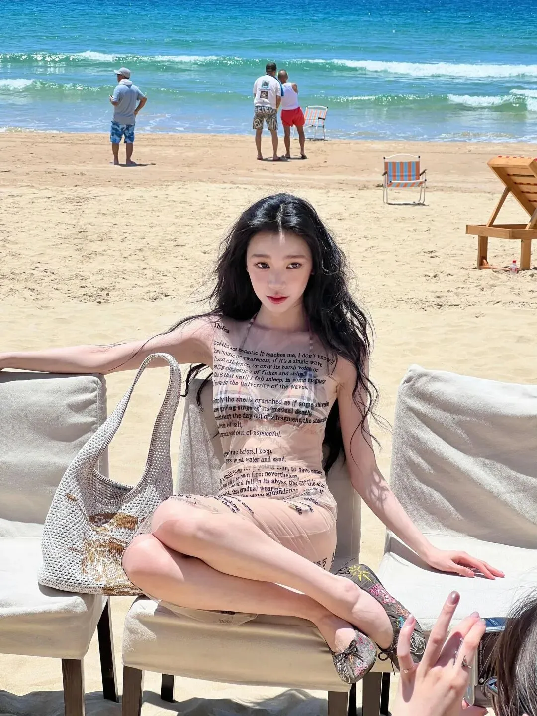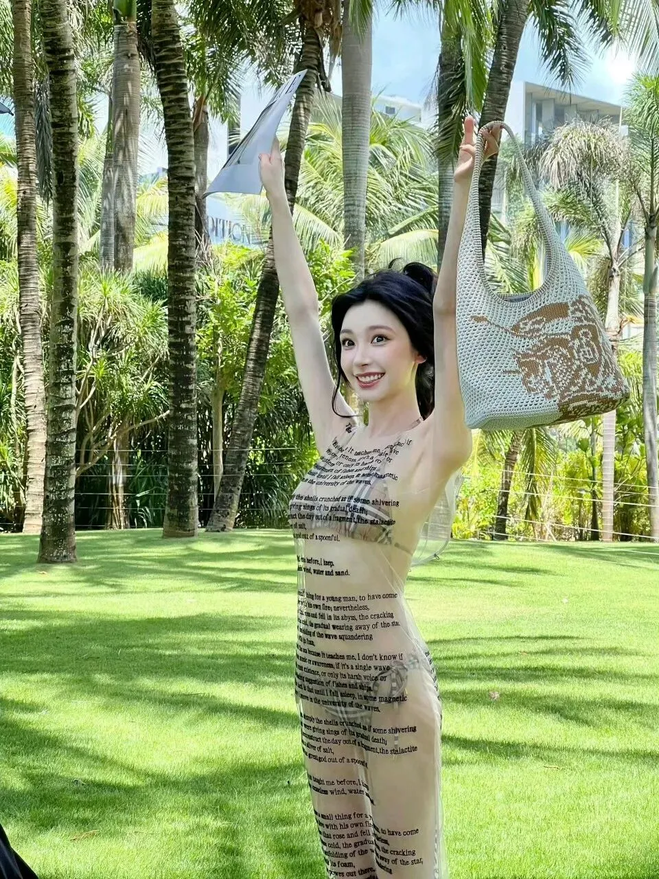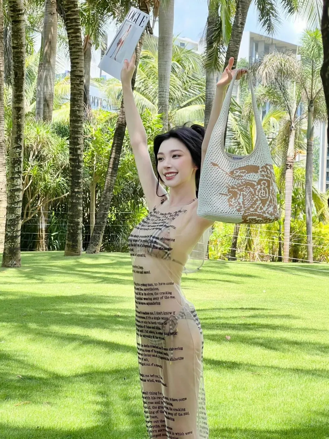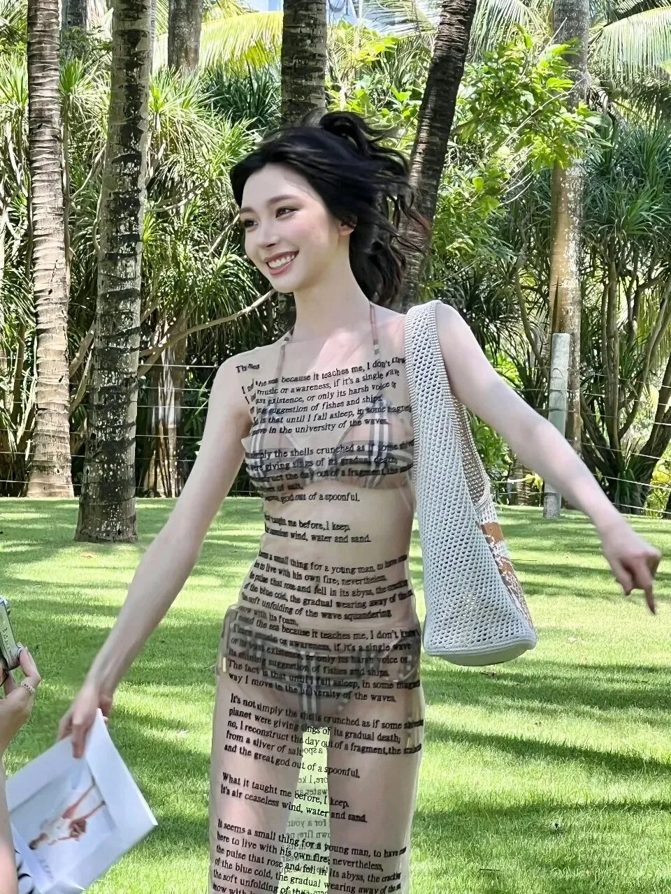 这组造型的妙处,在于材质与设计的巧妙碰撞。透视纱裙轻薄通透,印满了英文诗句,自带文艺又随性的气质,既不会过度暴露,又恰到好处地勾勒出身体曲线。内搭的格纹比基尼则增添了几分复古与俏皮,经典的格纹元素与纱裙的通透感形成对比,让整体造型既有层次又不失协调。没有夸张的配饰,没有浓艳的妆容,仅仅是简单的搭配,就将易梦玲的好身材与独特气质展现得淋漓尽致。