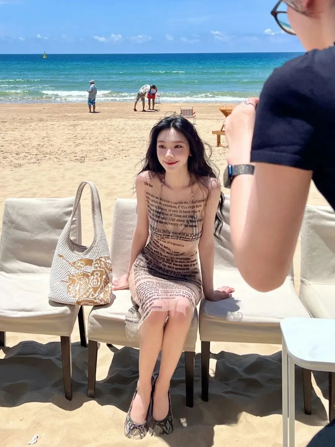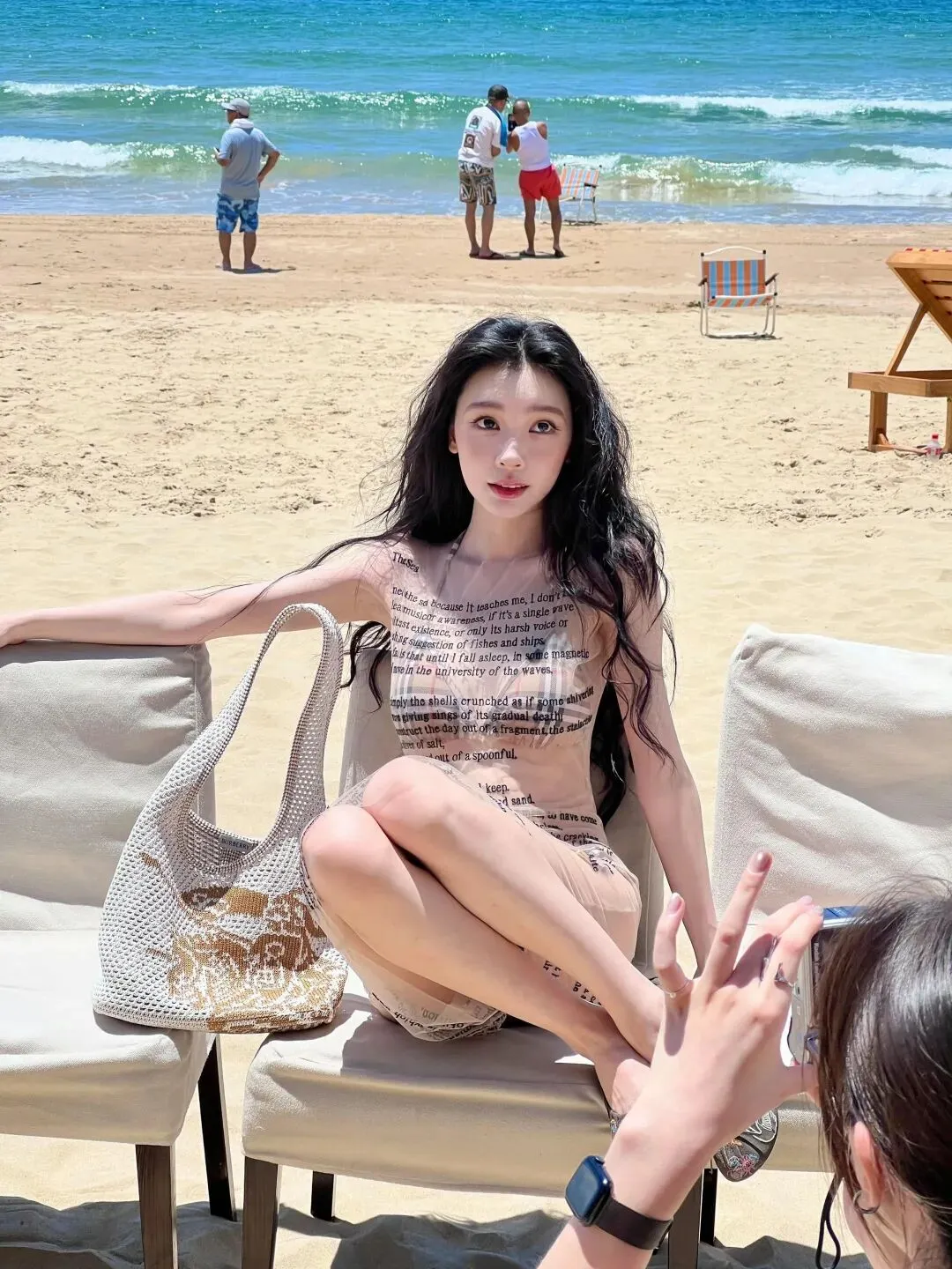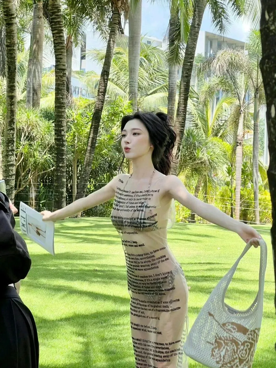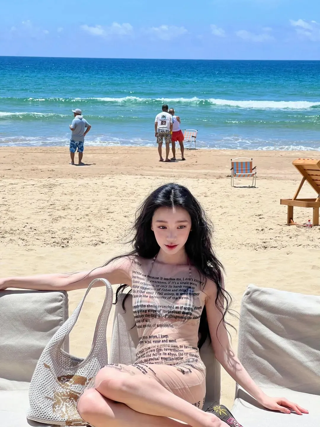 这组造型的妙处,在于材质与设计的巧妙碰撞。透视纱裙轻薄通透,印满了英文诗句,自带文艺又随性的气质,既不会过度暴露,又恰到好处地勾勒出身体曲线。内搭的格纹比基尼则增添了几分复古与俏皮,经典的格纹元素与纱裙的通透感形成对比,让整体造型既有层次又不失协调。没有夸张的配饰,没有浓艳的妆容,仅仅是简单的搭配,就将易梦玲的好身材与独特气质展现得淋漓尽致。
