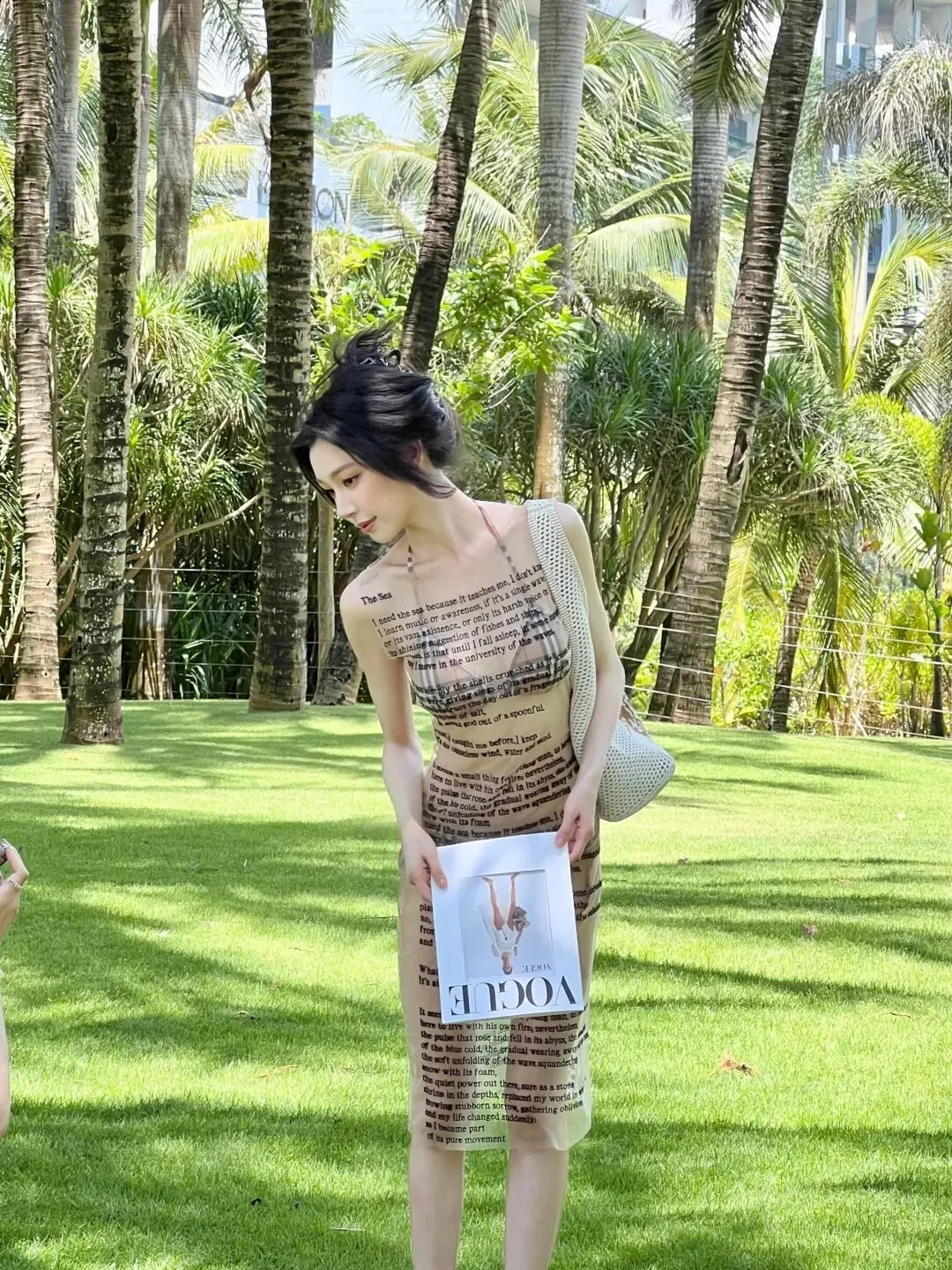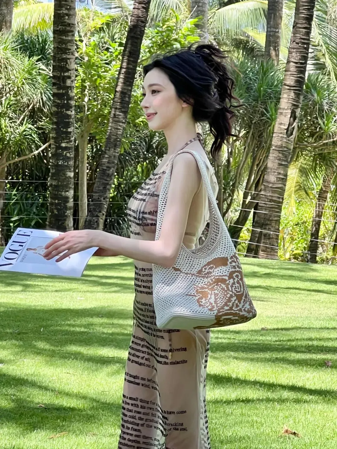 场景的选择更是为这组写真加分不少。翠绿的草坪、高大的椰树、湛蓝的海水,构成了最天然的背景板。易梦玲或手持VOGUE杂志,或挎着编织包,在草坪上肆意欢笑,发丝被风吹起,笑容明媚又治愈;或坐在沙滩躺椅上,眼神慵懒又勾人,与身后的海浪、沙滩形成一幅绝美的画面。这种不刻意摆拍的松弛感,比任何精致的布景都更有感染力,让人仿佛也能感受到海边的微风与阳光。