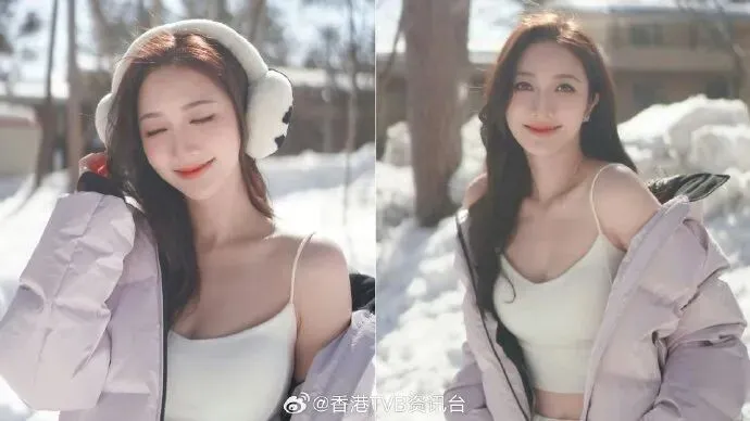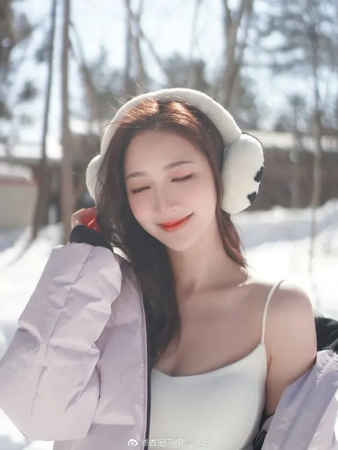 相中何依婷把身上厚厚的雪褛拉链拉开了,露出白色吊带低胸小背心,展现出诱人身材,性感迷人,相当养眼。