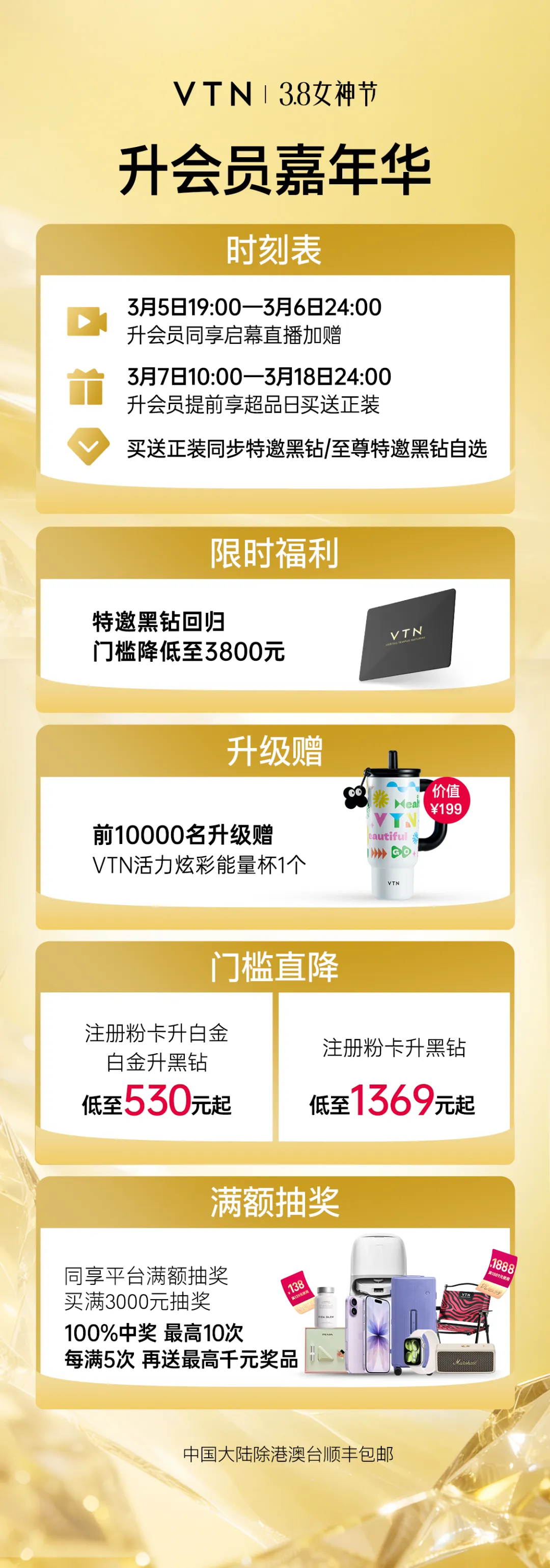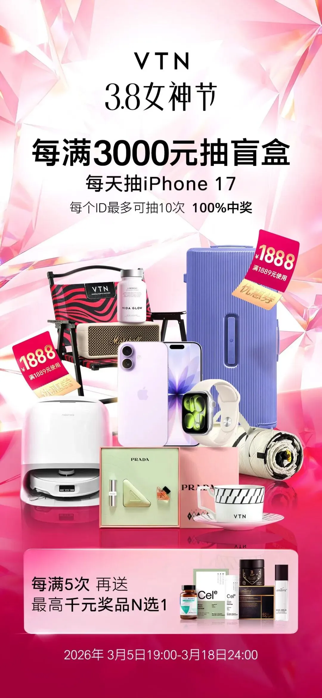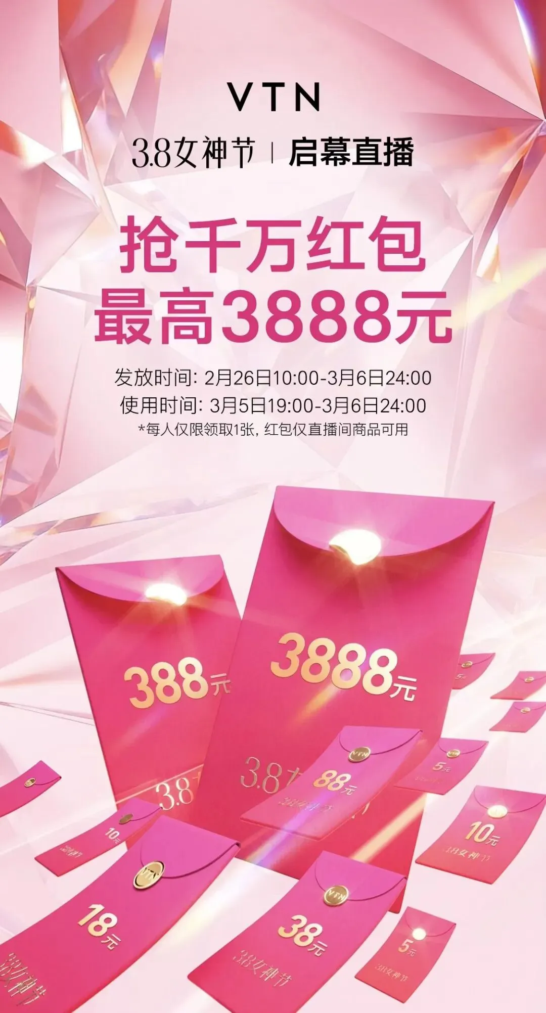 VTN·3.8女神节,1亿礼赠 宠爱加码,开启时间:3月5日 19:00 ~ 3月18日 24:00【北京时间】