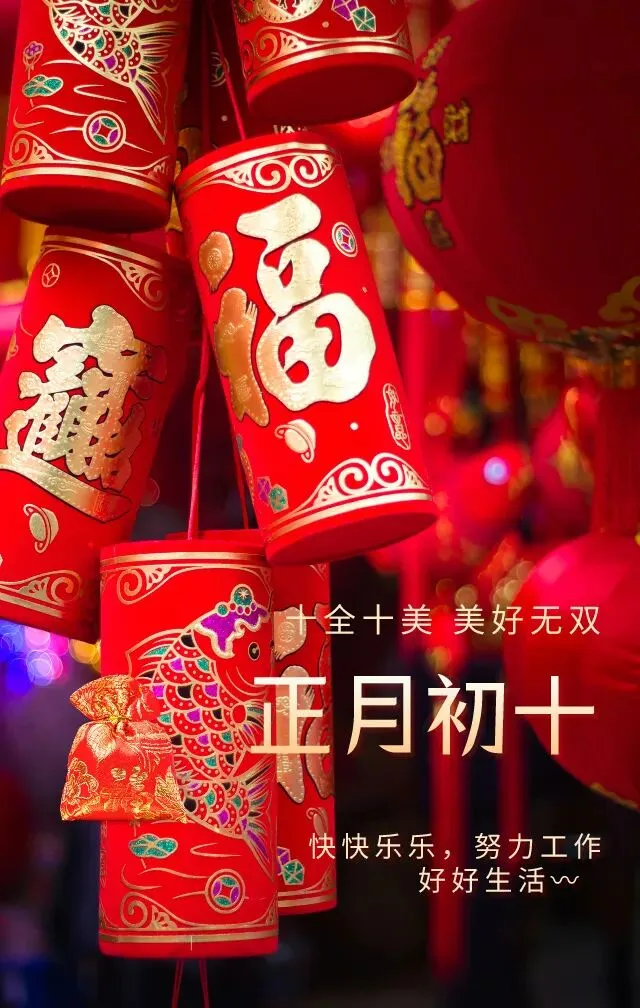 大年初十,十全十美的好日子,全心全意的祝愿,在崭新的一年里,快快乐乐的工作,健健康康的生活,拥有多姿多彩的心情,十全十美的人生。