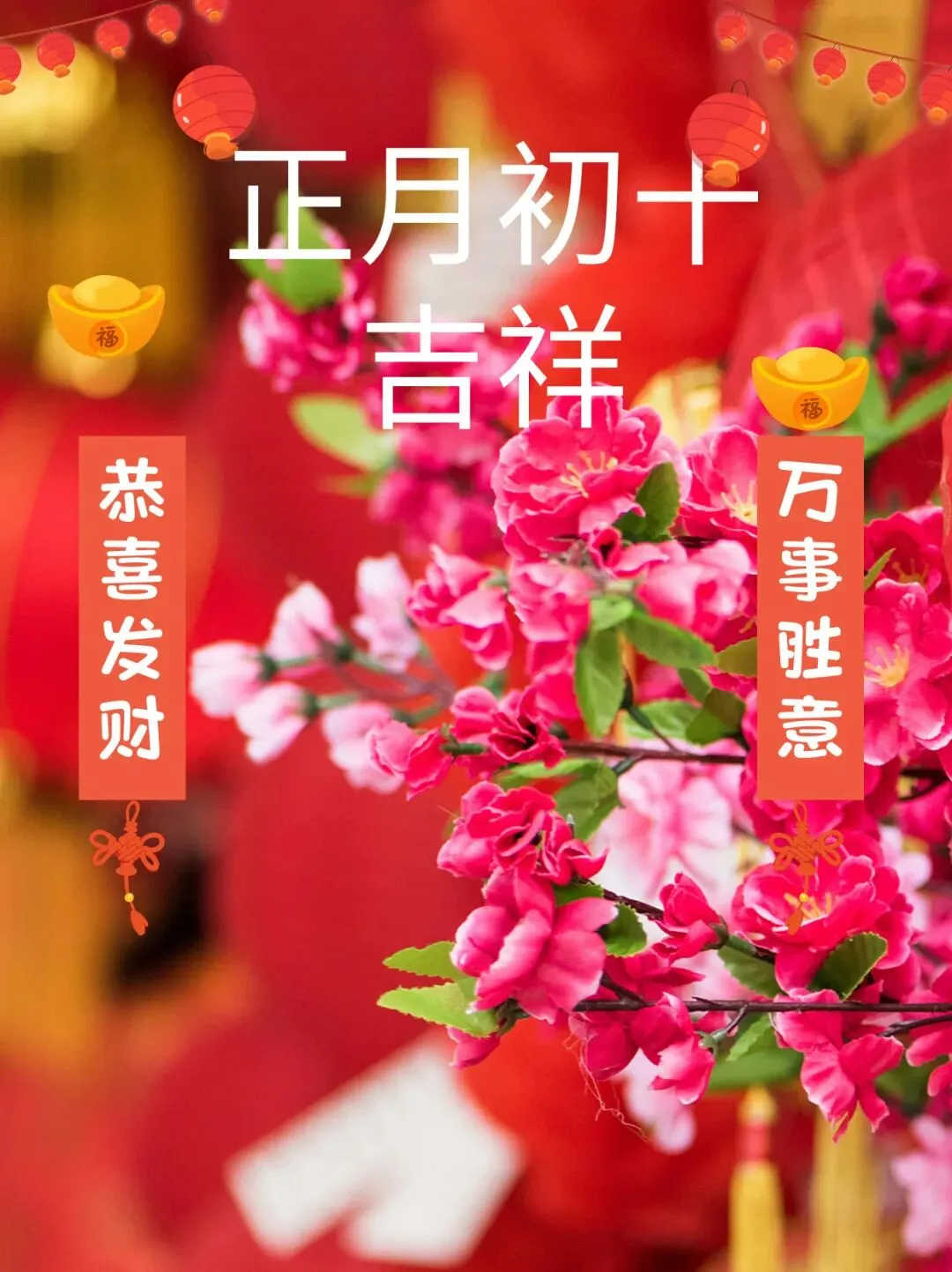 正月初十,十全十美的好日子,在此真诚的问候,实意的祝福,全心全意的祝愿,祝愿大家,在崭新的一年里,快快乐乐的工作,健健康康的生活,拥有多姿多彩的心情,十全十美的人生。