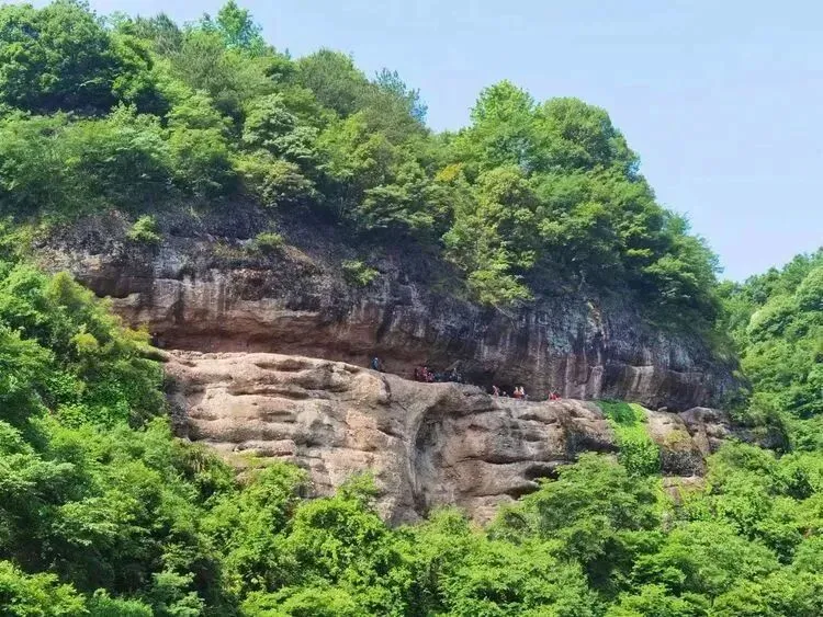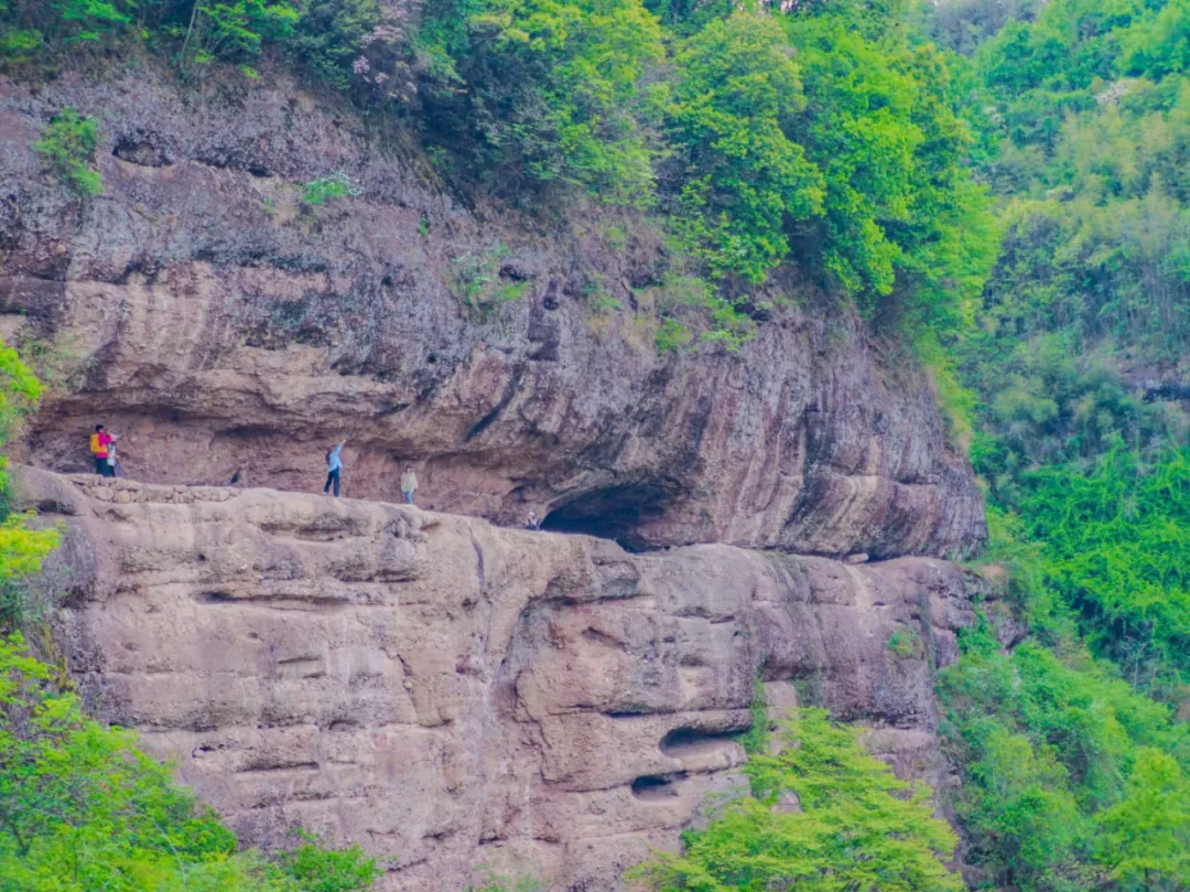 丹霞地貌特有的陡崖、洞穴与苍翠山林、清溪相映,