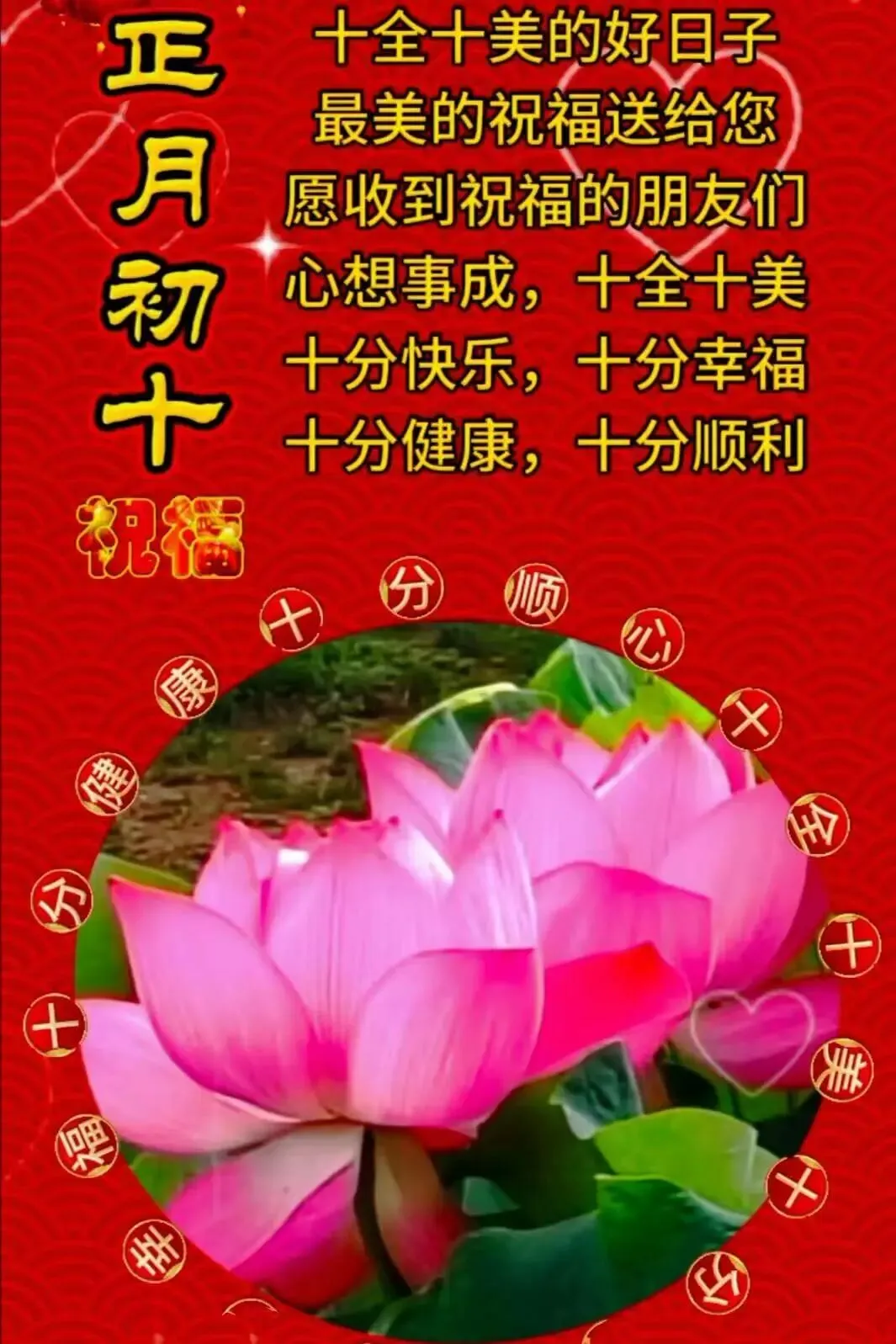亲爱的朋友,正月初十到来了☀️,无论现在的你在哪里📍,我都要为您送份十全十美的祝福🧧,十全十美日,愿您:日子比蜜甜🍯,笑口常开😄!也许祝福只是一种形式📝,却能带给我们温馨❤️,更能让我们安心😌,因此别吝啬彼此间的关心🤝,一样的日子一样的牵挂❤️,祝福大家在这个好日子里,快乐吉祥!🎉