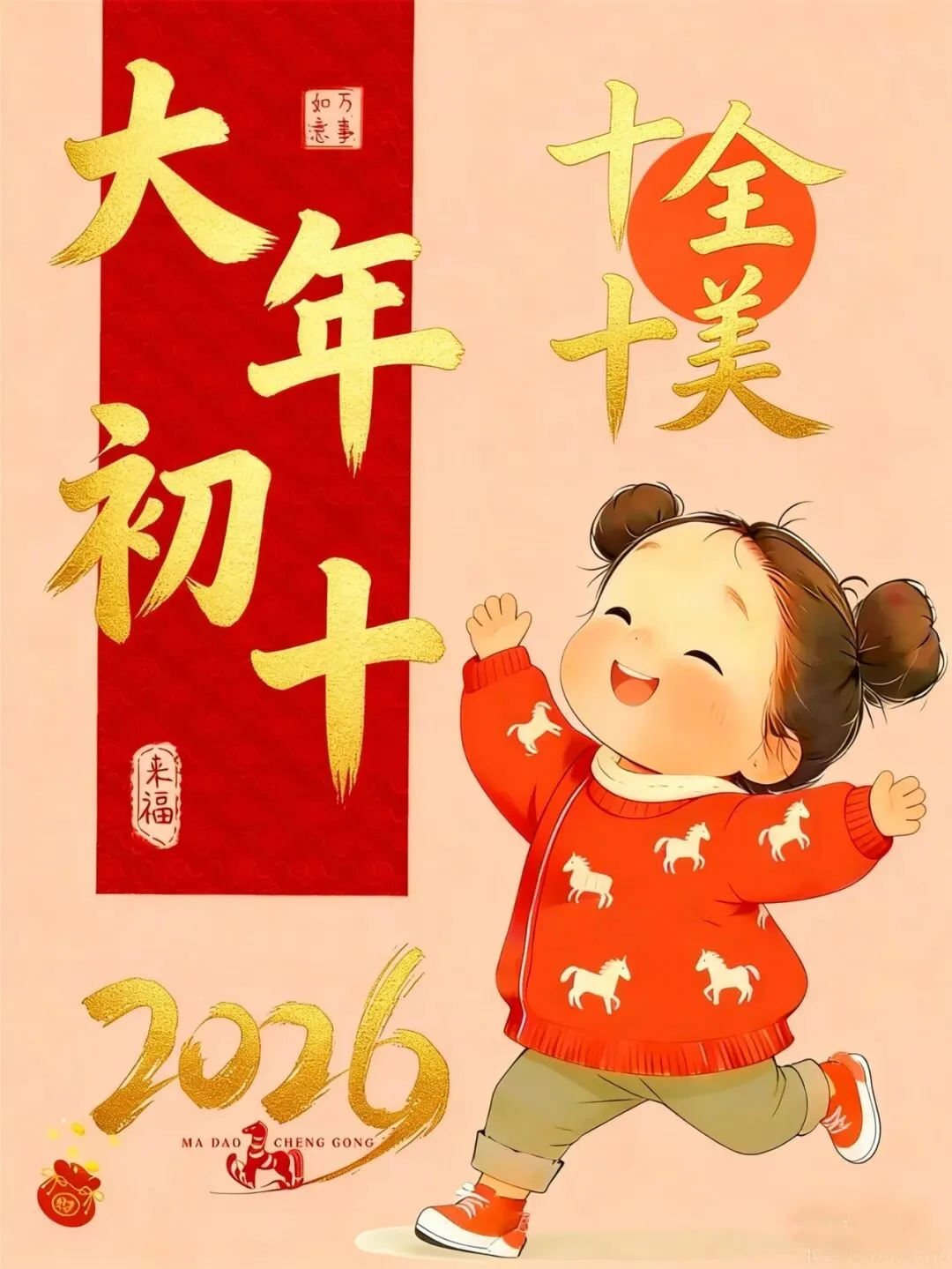 正月初十,十全十美,2026丙午马年,愿您:事业十分顺遂,生活十分如意,福气十分圆满,快乐十分长久!愿你马到成功,万事十全十美!