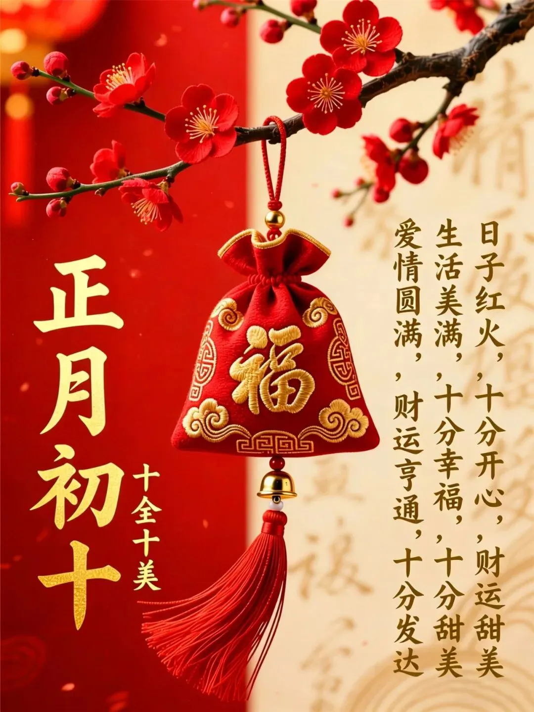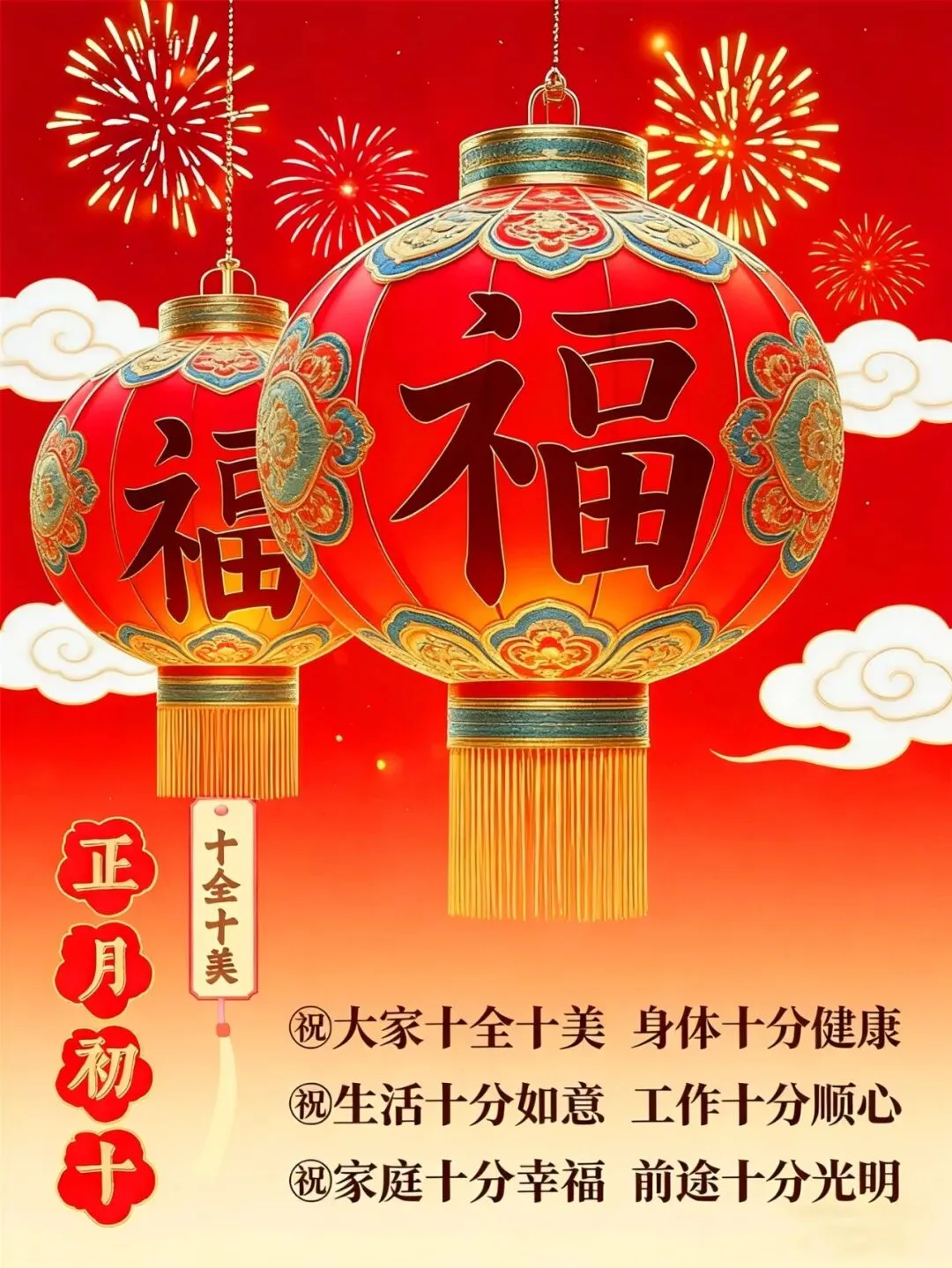 大年初十,十全十美好日子,愿你做事十拿九稳生活十分如意,家庭十分幸福十全十美的快乐,十全十美的人生岁岁常欢愉,年年皆安康!