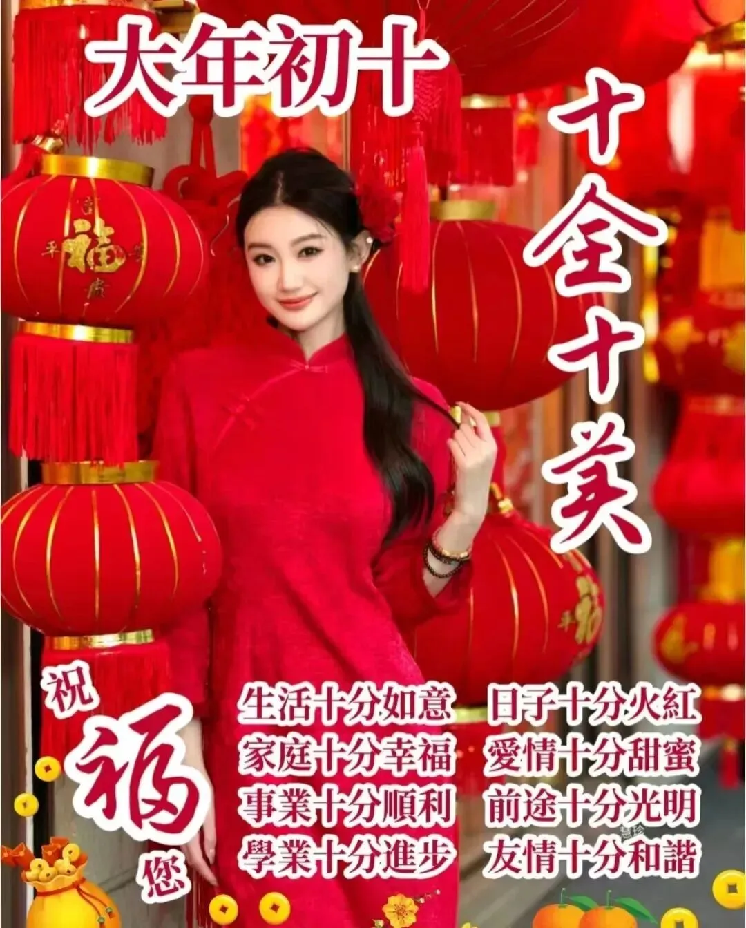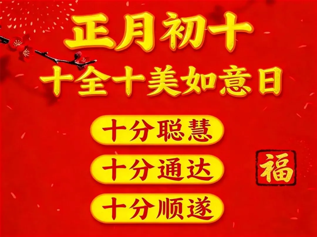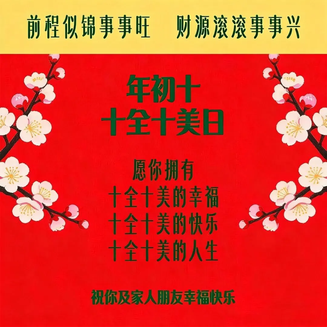 大年初十,一年一遇的十全十美日,一个喜庆吉祥的好日子。愿您拥有十全十美的幸福,十全十美的快乐,十全一美的人生,十全十美的心态!