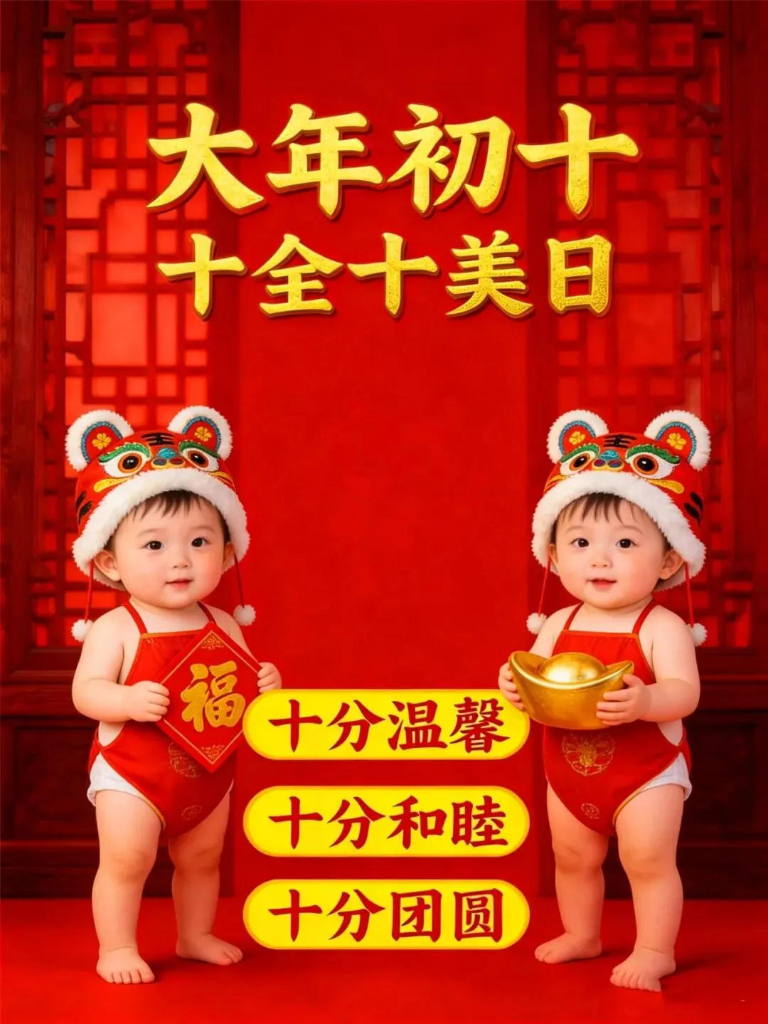 大年初十,春风送暖,福气满满,愿您平静的生活里 ,三分惊喜 七分尽兴 十分顺利,不问岁月深浅,只求流年安暖!