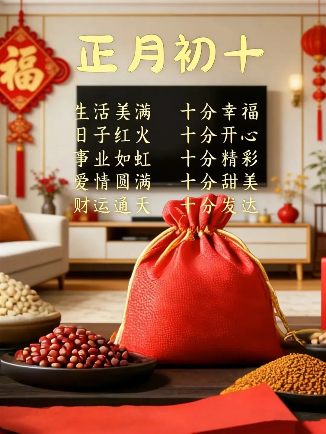 大年初十,马年纳福,十分初心,十分奔赴,十分财运,八方来财,十分健康,百岁无忧,马年行大运,事事皆圆满!