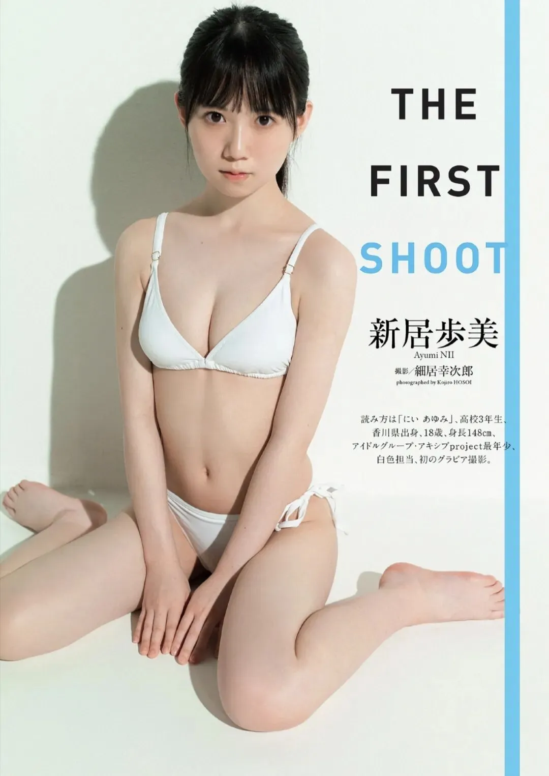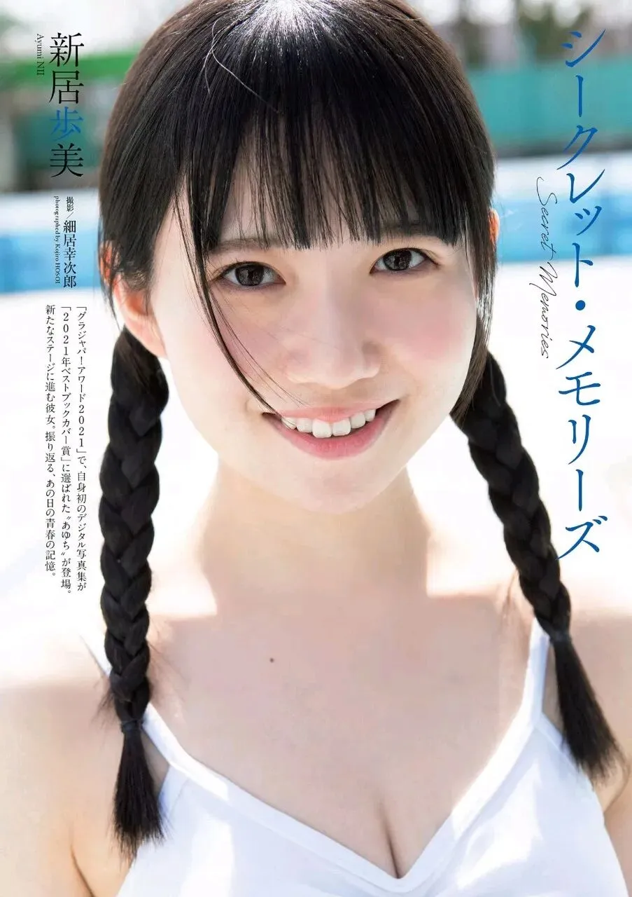 与参与同一期杂志照片拍摄的其他写真偶像不同,新居步美在杂志靠后的位置,青涩的、睁开一双无辜的眼睛就开启了写真之路,同一期的封面人物是浅仓唯和后来的写真女王菊地姬奈。