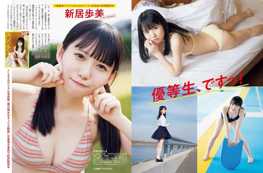 5个月后,新居步美登陆了FLASH周刊,FLASH也用了“优等生”的标签来描述新居步美的写真风格。