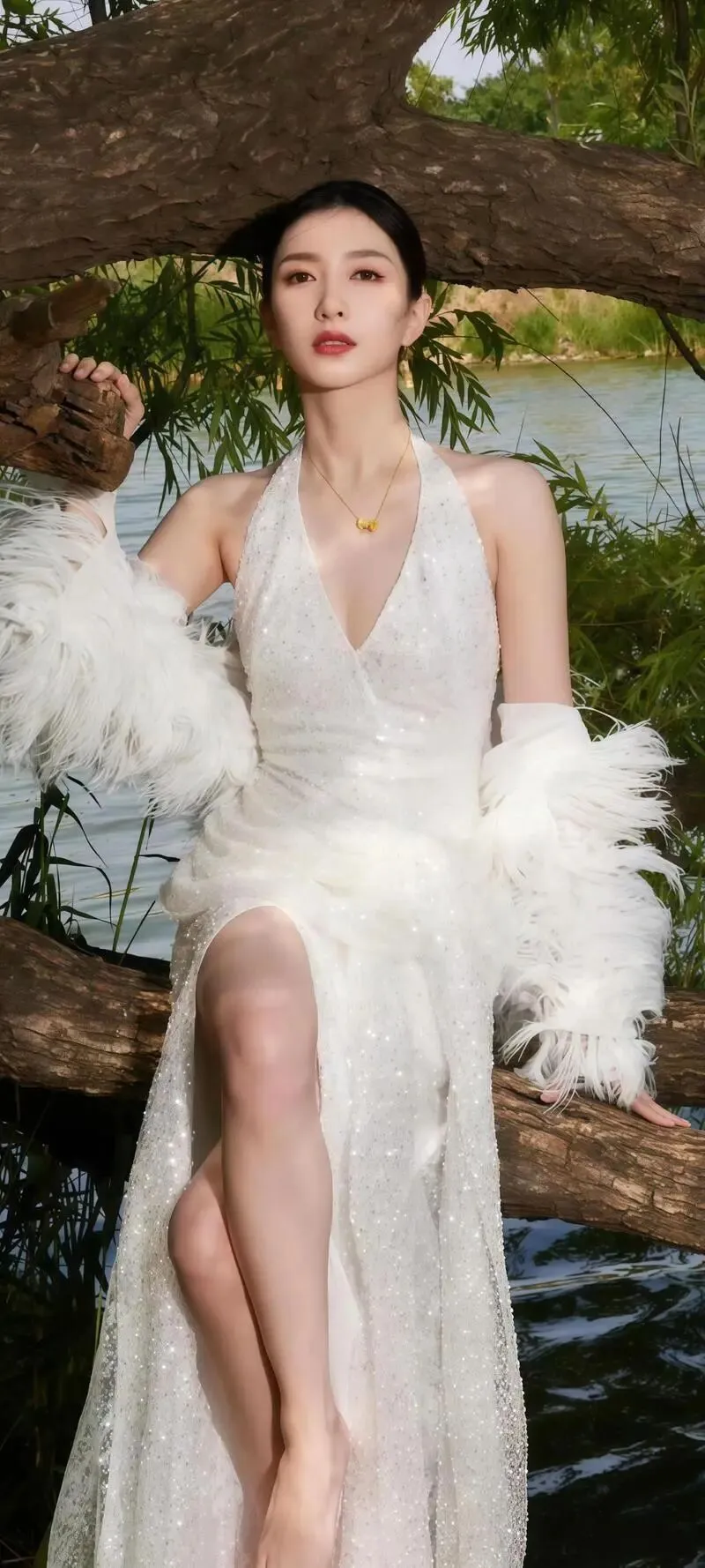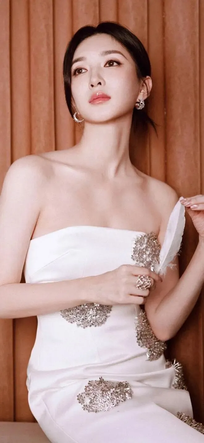 江疏影穿着白色吊带短裙,她俏脸清丽脱俗,五官精致,长发飘逸,这位美女坐在椅子上,露出白皙的香肩和修长的大美腿,魔鬼身材尽显无疑,绝对性感撩人!