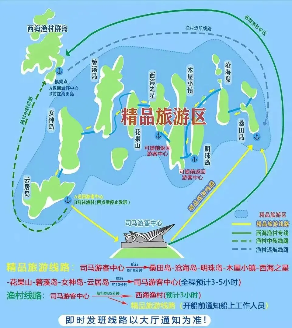 3.A.所有团队需按照景区船艇线路游玩景点,不可随意更改线路或者自行选择线路;B.每个岛屿景点船艇停靠时间为1小时30分钟;C.如要提前离开岛屿景点至下一个岛屿景点或返回码头,根据行程距离由游客自行承担相关成本费用;