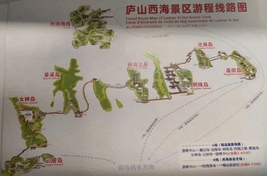 庐山西海是一处集国家级风景名胜区、国家5A级旅游景区、国家水利风景区、国家森林公园、国家体育旅游示范基地创建单位、全国中小学研学实践教育基地、全国十佳生态旅游示范区、全国佛教样板丛林为一体的山岳湖泊型特大景区,总规划面积495平方公里。景区交通便利,福银高速、大广高速、京九铁路擦肩而过,江西省第一条旅游高速公路——永武高速抱湖而行。