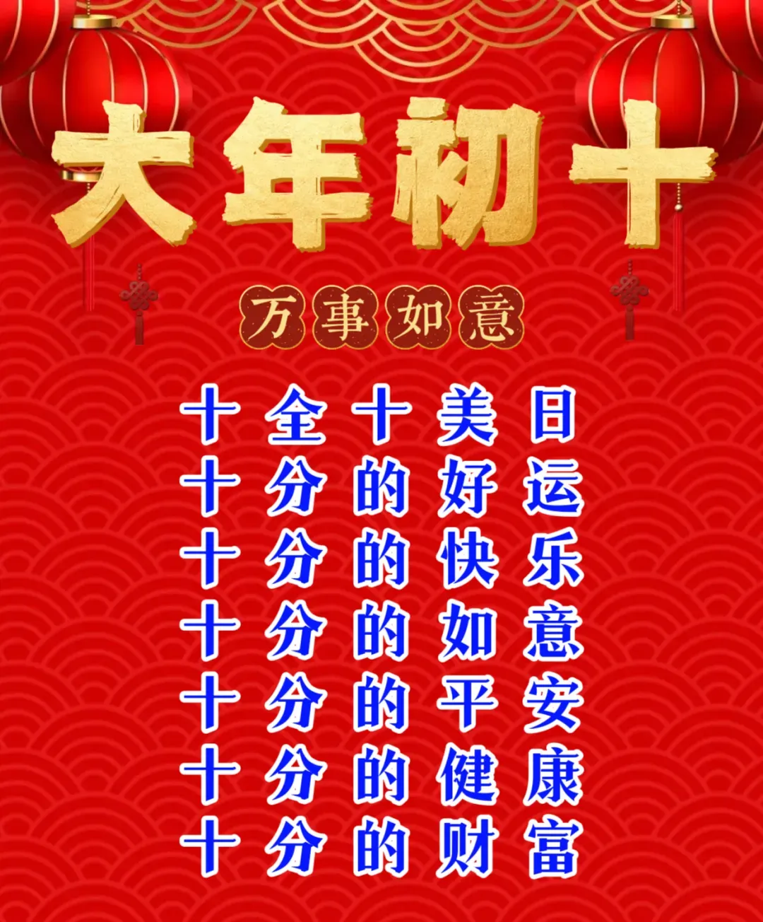 🌈今天是大年初十,💙十全十美好日子,💝送你十分的好运,🌞十分的快乐,🌸十分的健康,🌻十分的幸福,🌹十分的如意,🍃十分的平安,💥十分的富有!🌅
