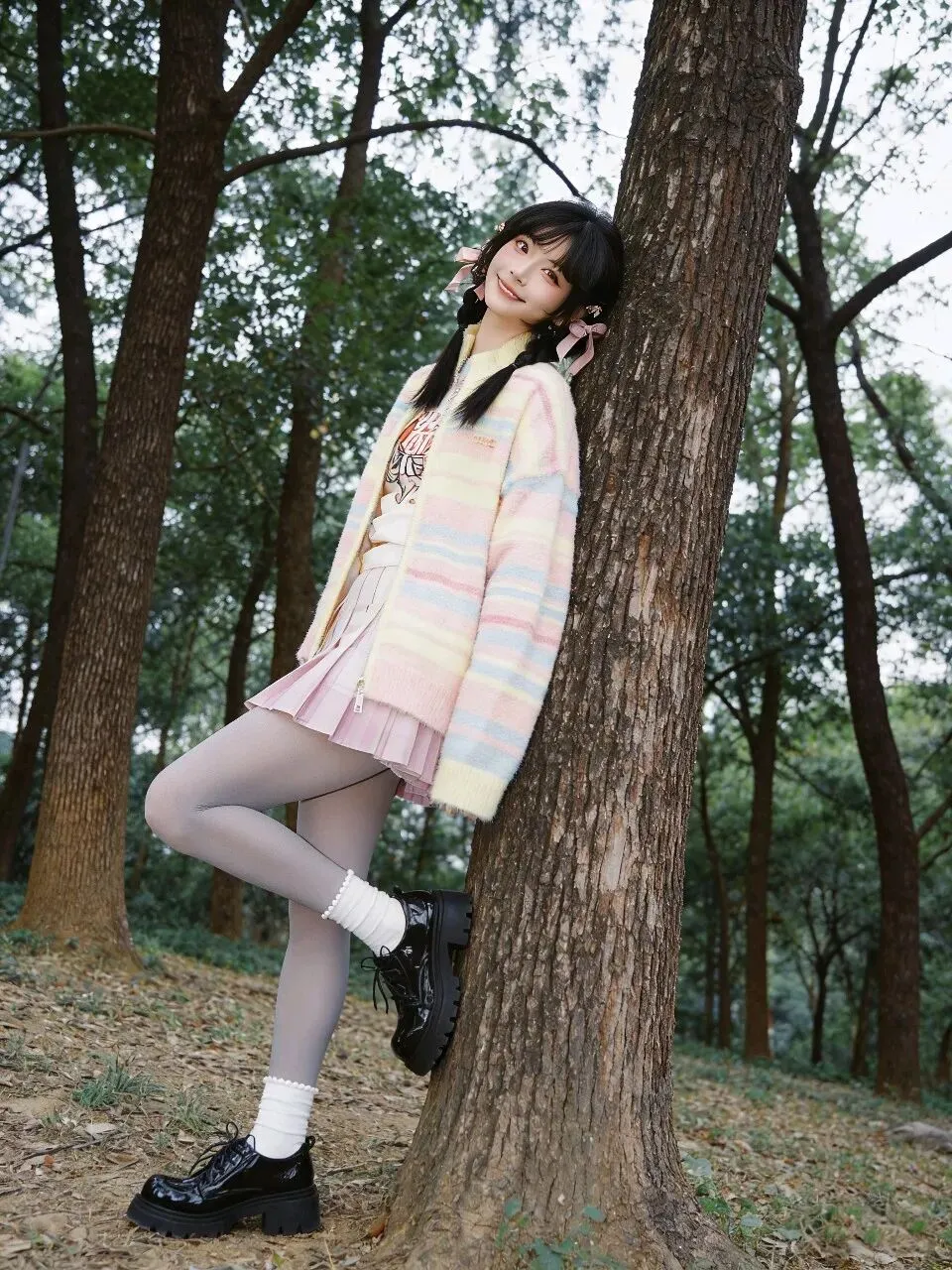 下装:短裙 + 丝袜 + 堆堆袜 + 厚底鞋。这是拉长腿部比例的“作弊公式”!短裙负责俏皮,彩色丝袜增加个性和甜度,白色蕾丝花边堆堆袜是点睛之笔,增加了复古少女感,最后用黑色厚底皮鞋压住全身,既显高又避免头重脚轻。