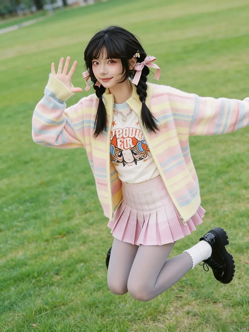 上装:毛衣外套 + 内搭T恤。这是春秋季甜妹穿搭的万能公式,既有温度又有层次。外套敞开穿,露出内搭的图案,增加细节(图2)。