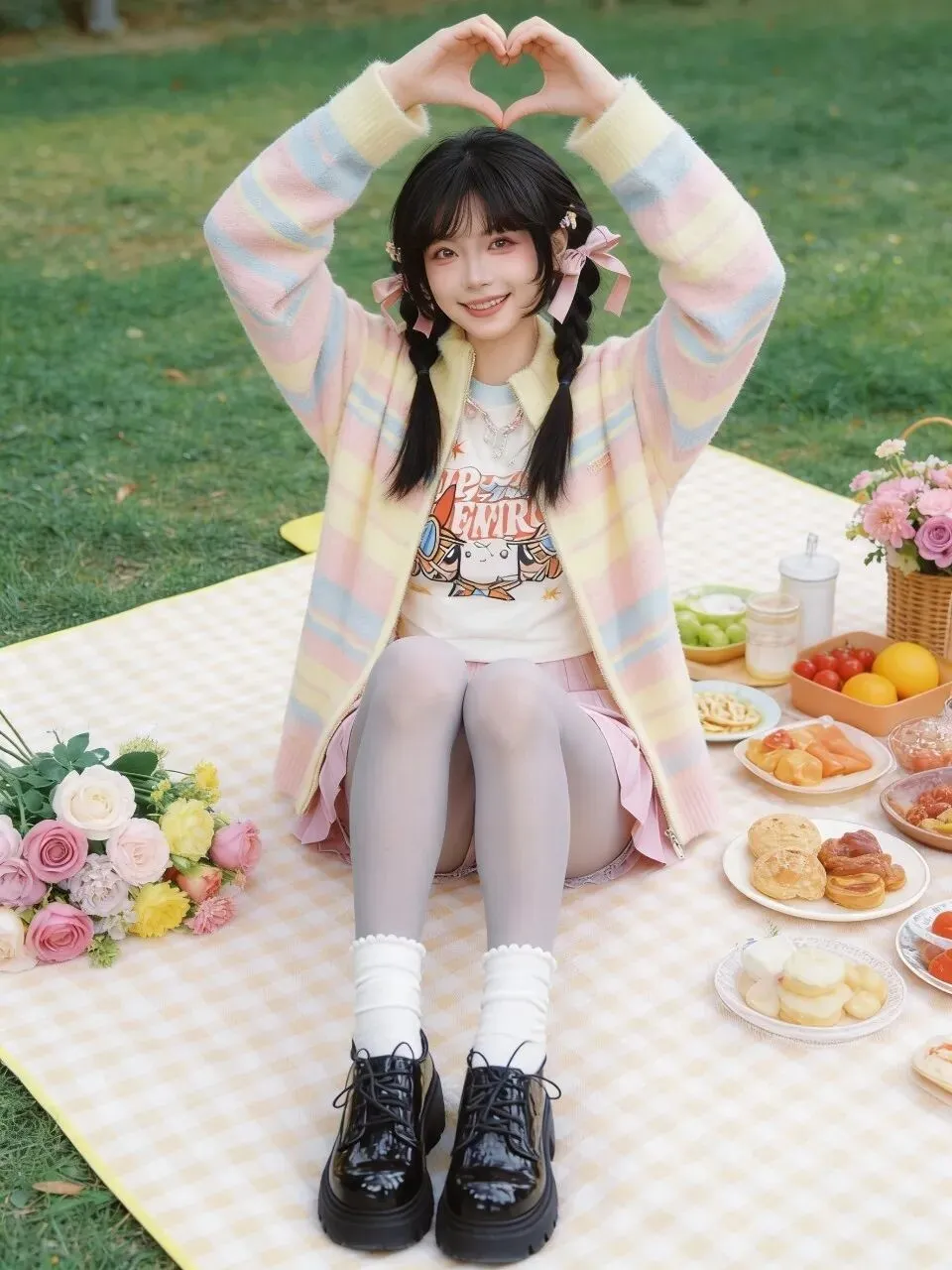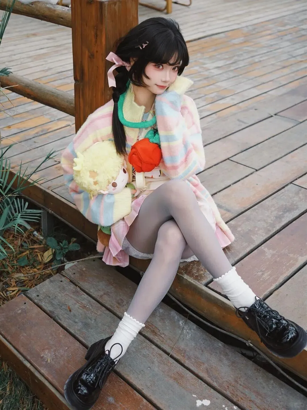 给男同胞/想模仿的姐妹的总结:想拍出这种效果,记住一个公式:一件彩色主体上衣 + 基础色内搭和下装 + 1-2个亮色配饰(袜子/发饰/道具)+ 厚底鞋。玩偶和花朵是氛围感神器,必入!